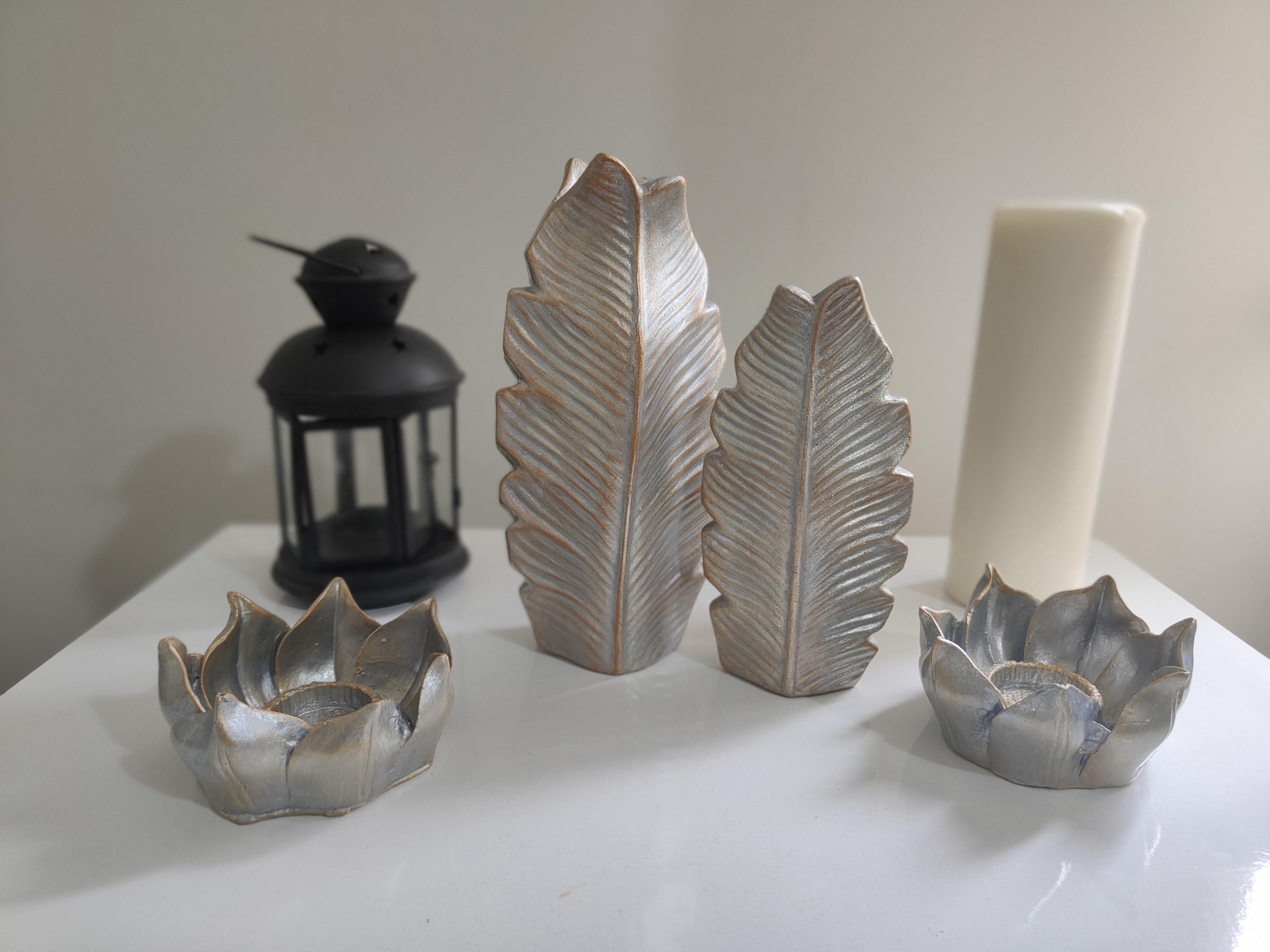 El emeğiyle seramik tozundan üretilen Altın Esintili Gümüş Vazo ve Lotus Mumluk Seti, gümüş rengin asaletiyle altın dokunuşlarını buluşturarak göz alıcı bir uyum sunar. İki farklı boyuttaki dekoratif vazo ve zarif lotus formundaki mumluklar, modern ve klasik dekorasyonlarla mükemmel uyum sağlayarak yaşam alanlarınıza estetik bir hava katar. Şıklığı detaylarda arayanlar için benzersiz bir seçim!