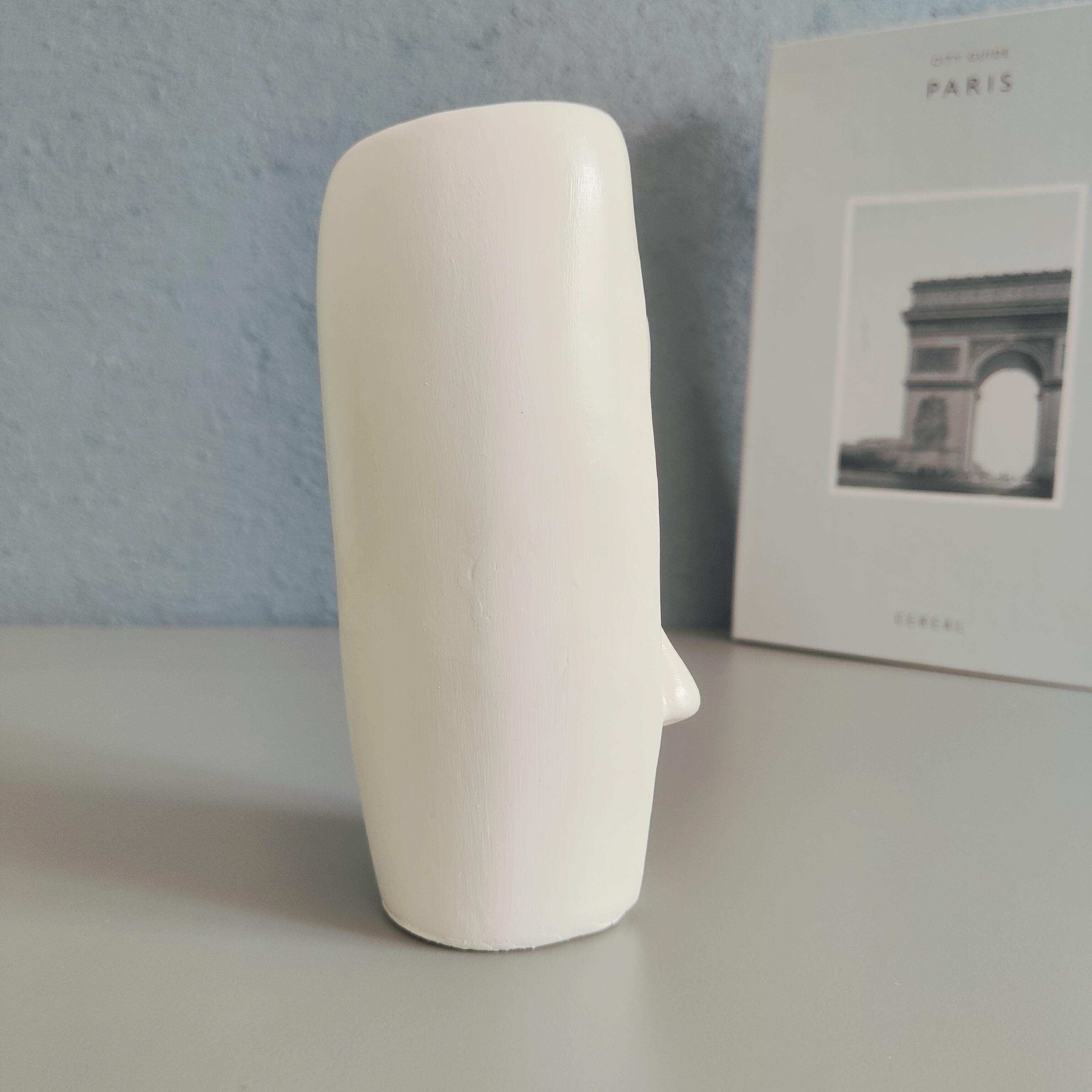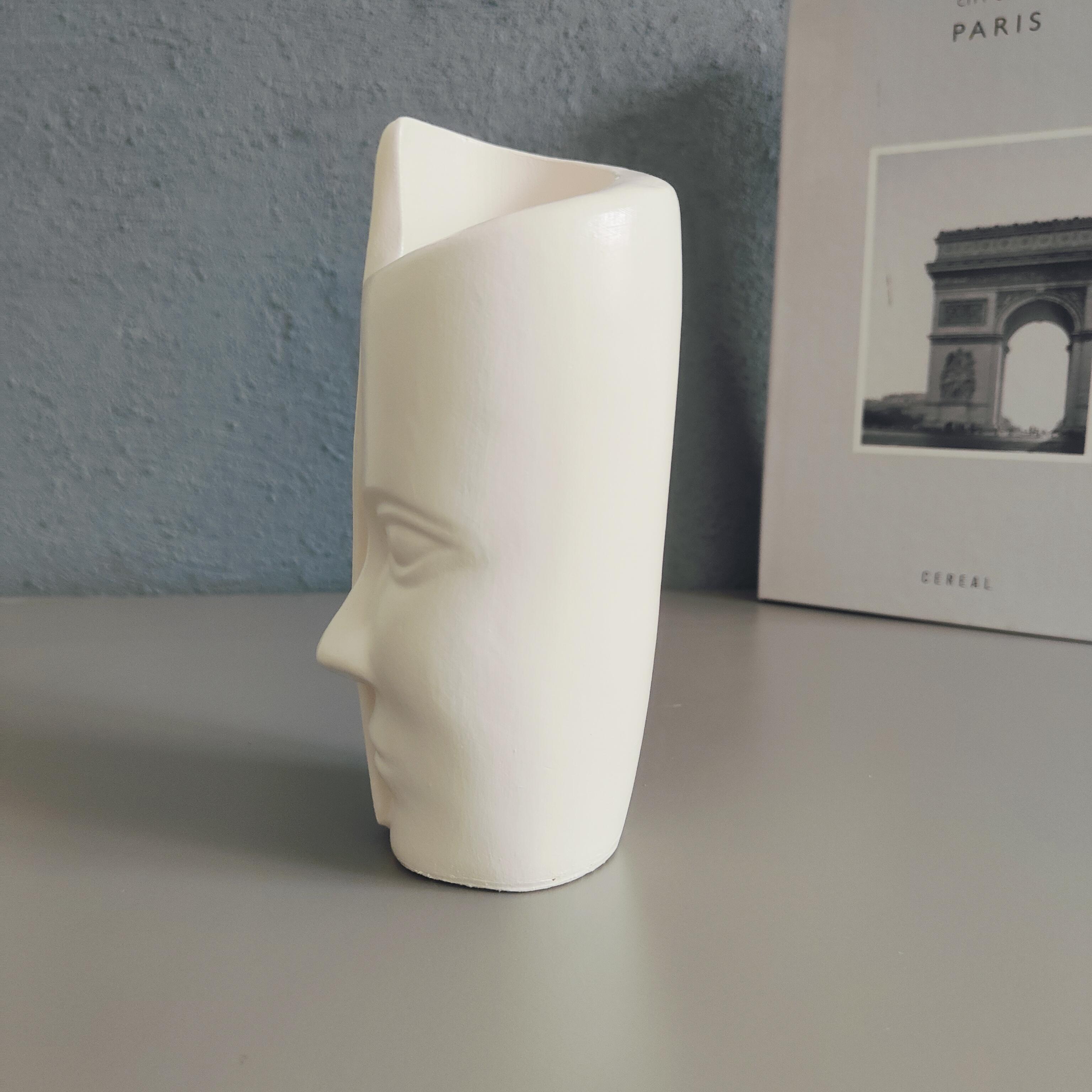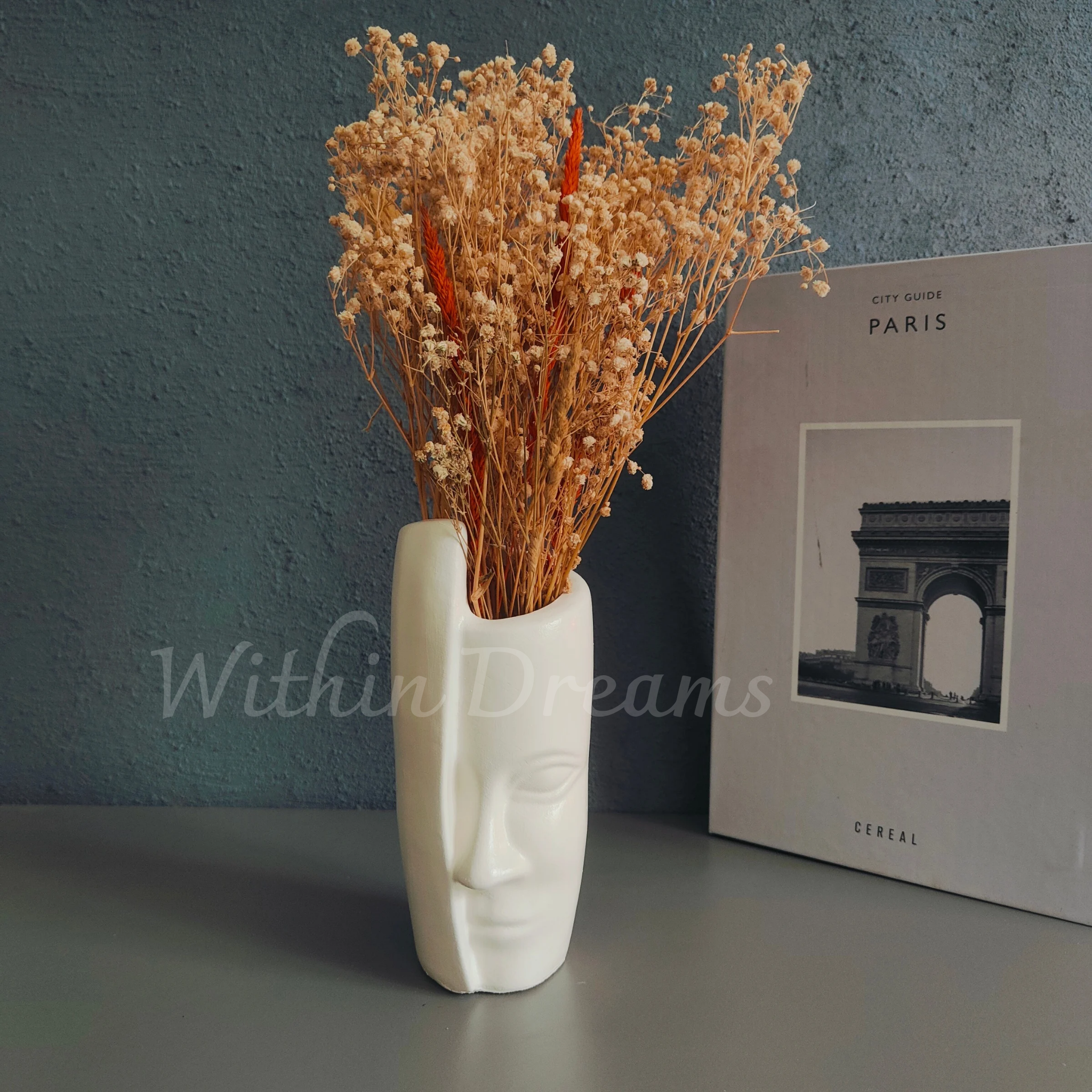 "Soyut ve zarif tasarımıyla dikkat çeken bu yarım yüz vazo, estetik anlayışınızı yansıtan özel bir dekoratif parçadır. Seramik tozundan elde üretilmiş, Beyaz akrilik boya ile özenle boyanmıştır. El emeğiyle şekillendirilen bu benzersiz vazo, mekânınıza modern ve sanatsal bir dokunuş katmak için tasarlandı."