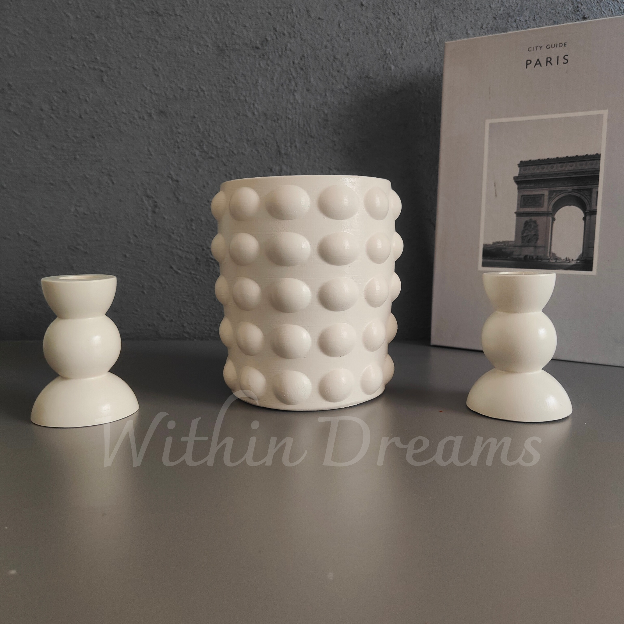 Vazo yükseklik 14 cm &şamdan 8 cm. "Zarif ve modern tasarımıyla dikkat çeken bu set, bir adet bubble (baloncuk) şeklindeki vazo ve iki adet şamdan içeriyor. El emeğiyle seramik tozundan üretilmiş olan bu set, zarif formu ve minimal tasarımıyla mekânınıza şıklık katıyor. Vazo, çiçeklerinizi zarif bir şekilde sergilerken, şamdanlar ise ortamınıza sıcak bir ışık ve sofistike bir atmosfer ekliyor. Hem estetik hem de fonksiyonel bir dekorasyon parçası arayanlar için ideal bir seçim!"