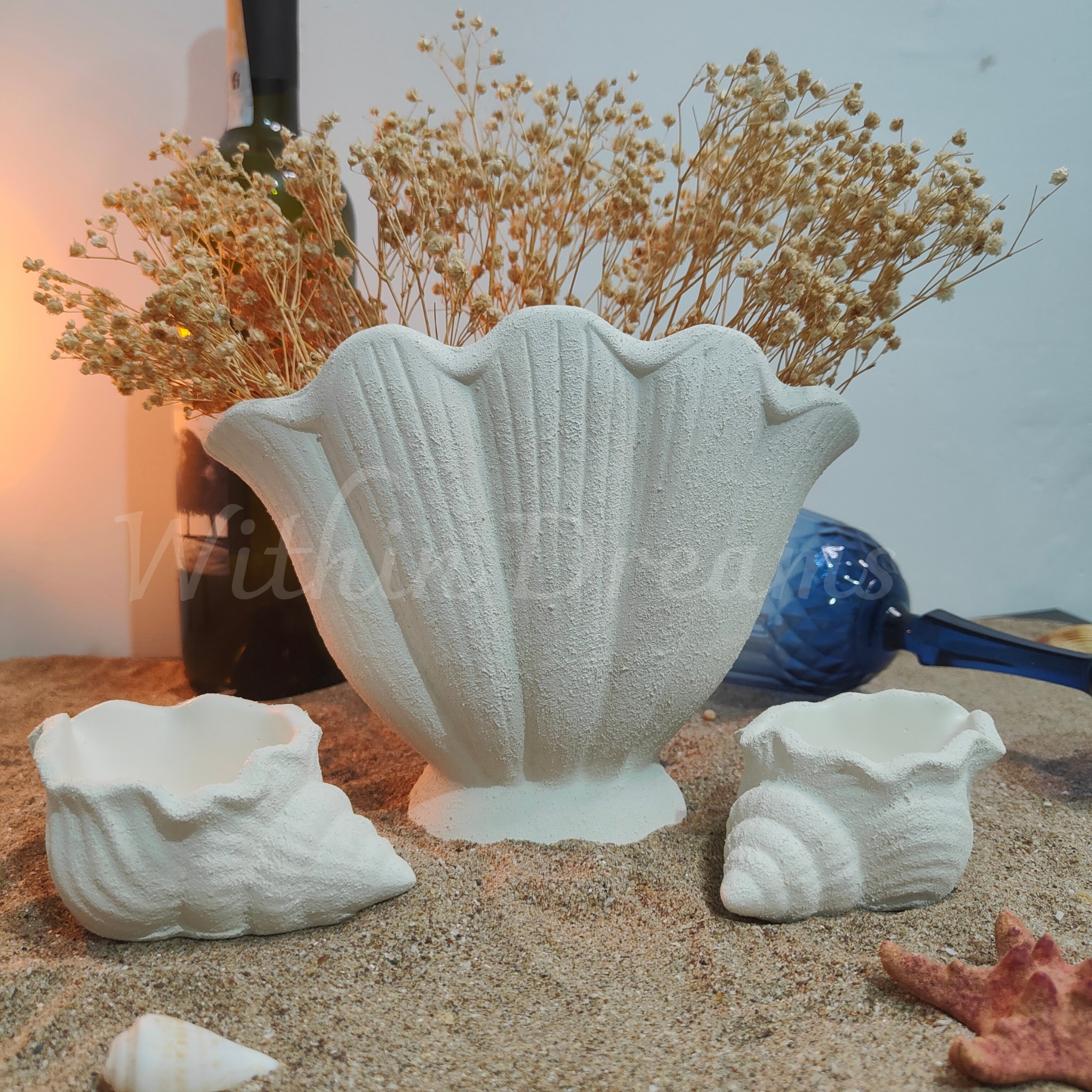 El emeğiyle özenle şekillendirilmiş bu özel set, seramik tozundan üretilmiş olup doğal dokusuyla dikkat çeker. İstiridye formunda şık bir vazo ve deniz salyangozu şeklinde iki zarif mumluk, denizin zarafetini ve doğallığını evinize taşıyor. Dokulu yüzeyi sayesinde hem görsel hem de hissedilebilir bir estetik sunan bu set, mekânınıza sofistike ve huzurlu bir hava katıyor. Kendiniz ya da sevdikleriniz için benzersiz ve anlamlı bir dekoratif hediye alternatifi!