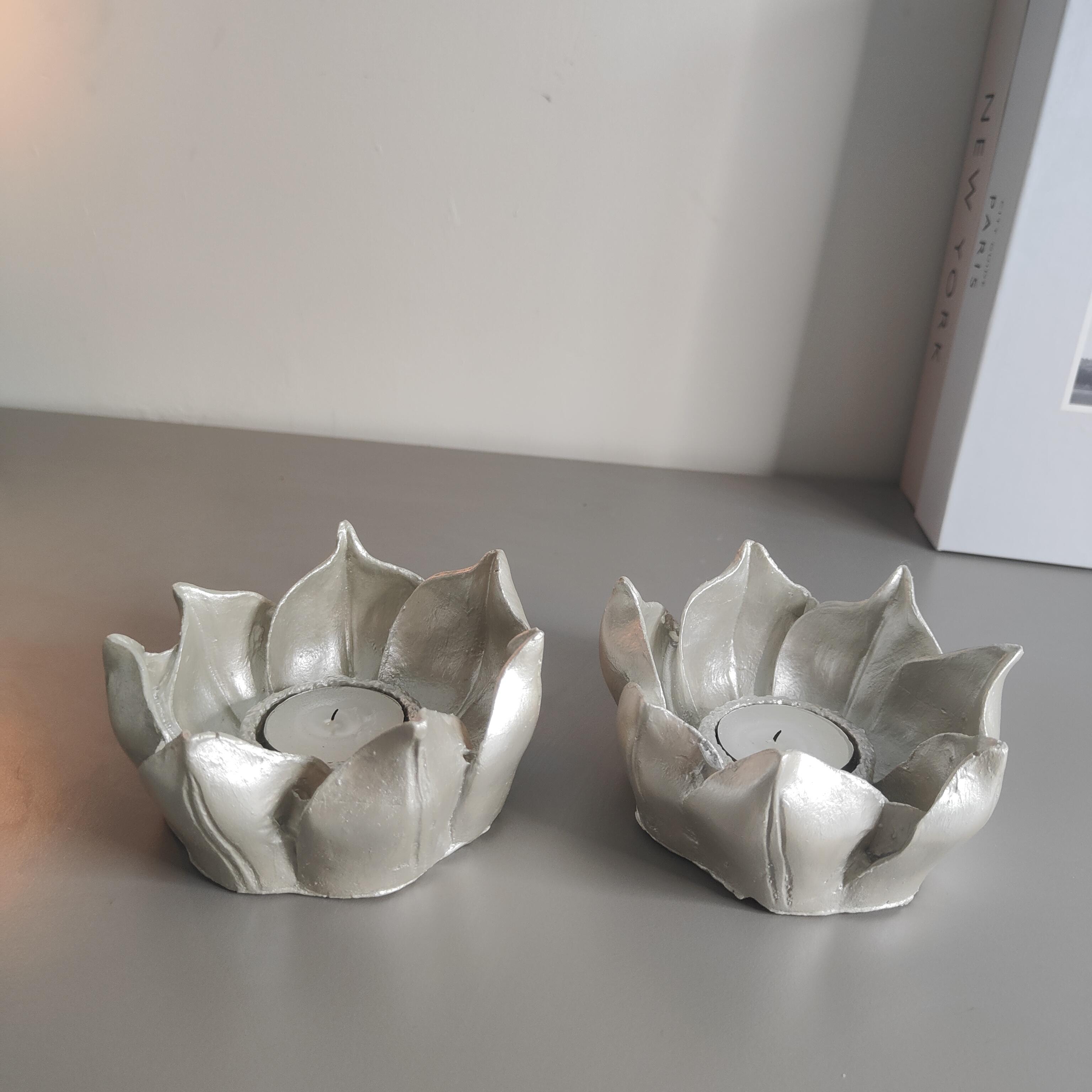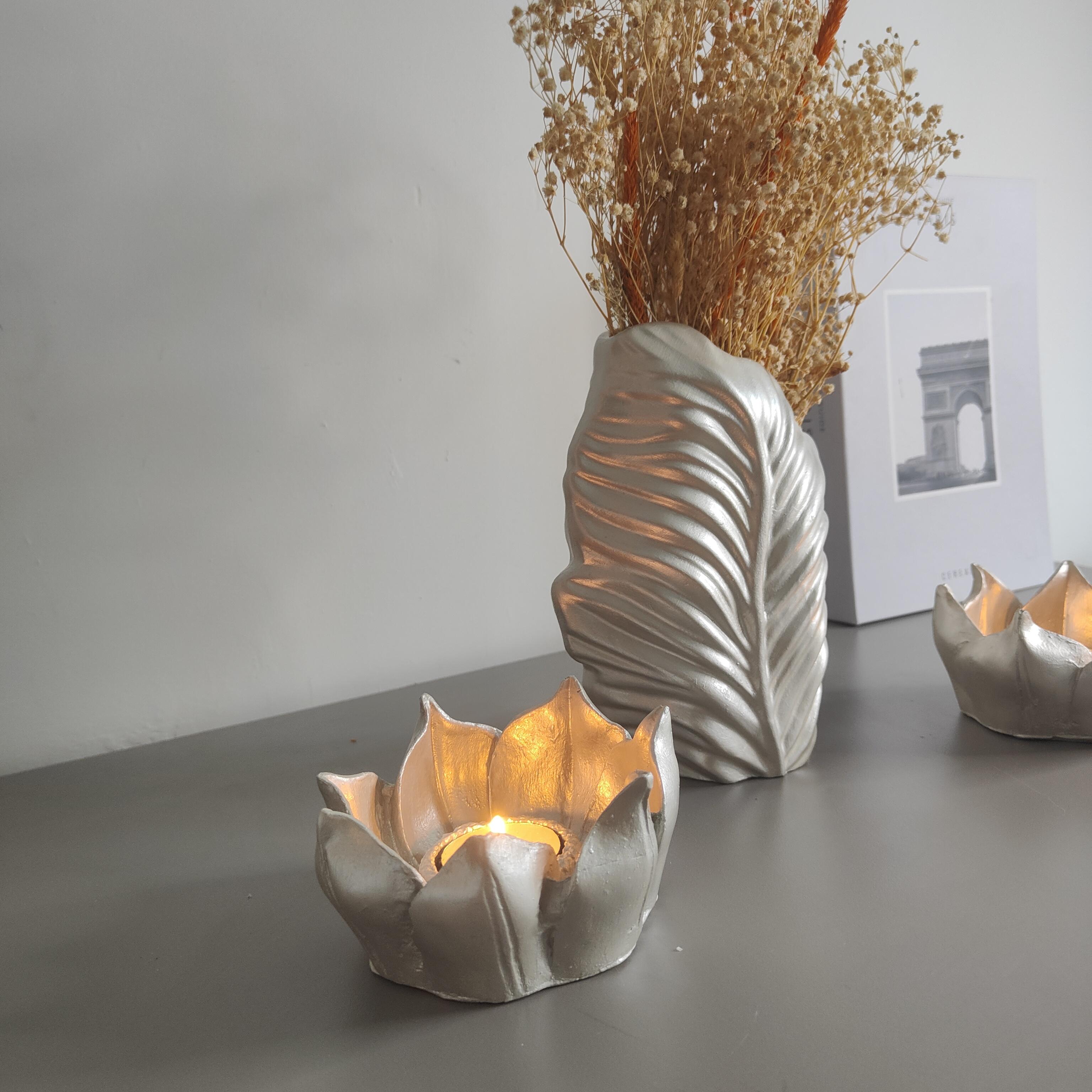 Zarif lotus çiçeğinden ilham alınarak tasarlanan bu el yapımı gümüş renkli mumluk seti, dekorasyonunuza sofistike bir dokunuş katmak için özenle üretildi. Seramik tozu kullanılarak elde şekillendirilen bu özel tasarım, detaylı işçiliği ve modern görünümüyle göz kamaştırıyor.