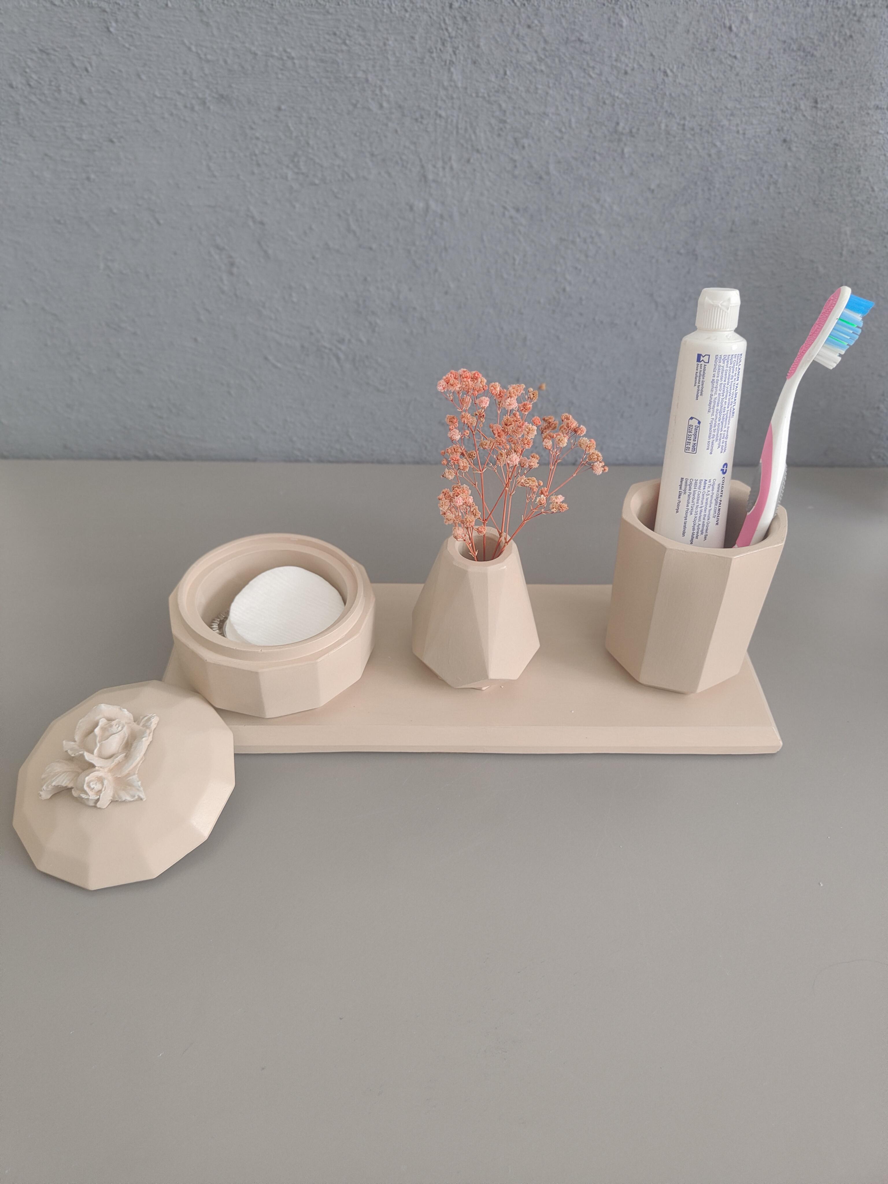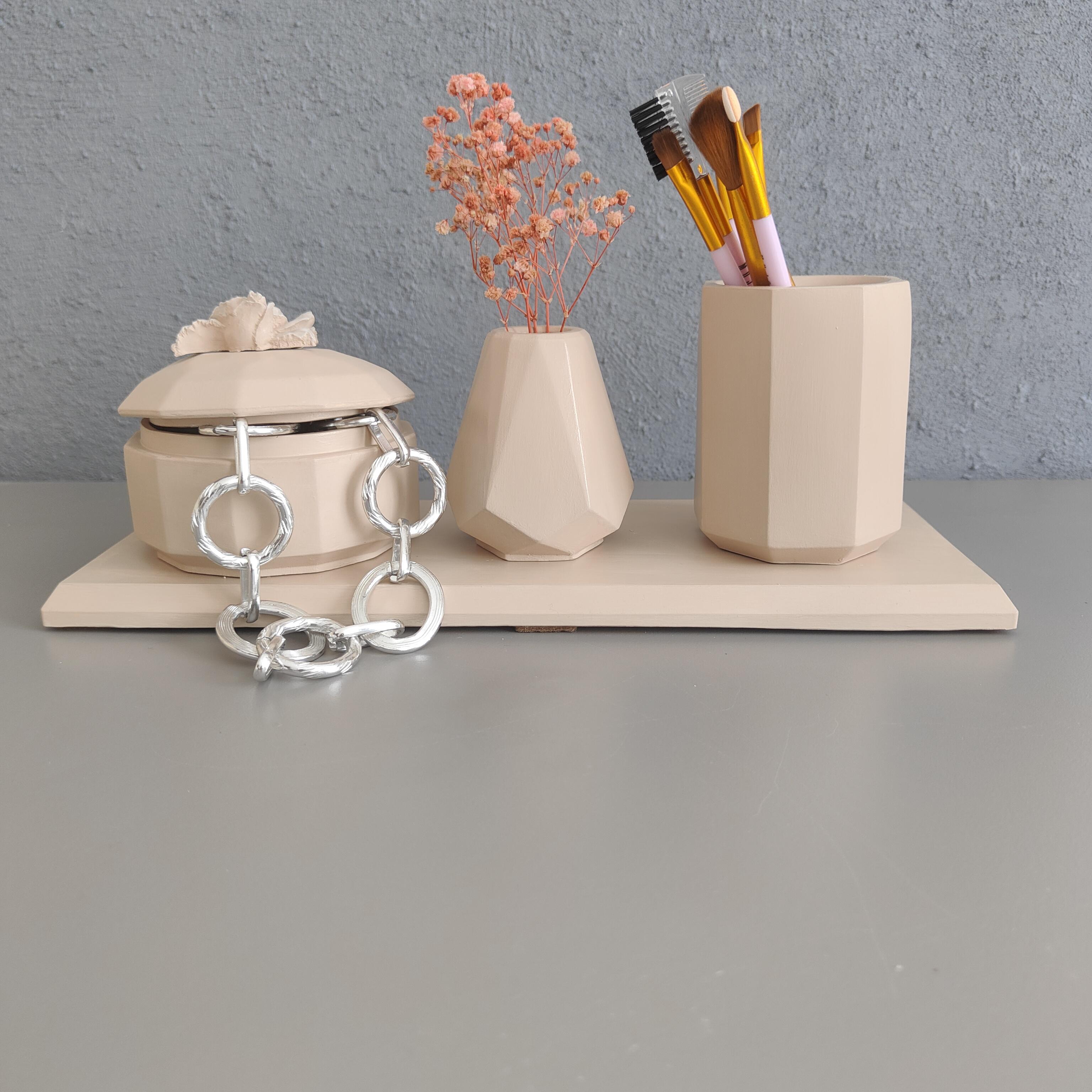 Bu şık ve kullanışlı set, el emeğiyle özenle hazırlanmış olup seramik tozu kullanılarak dökülmüştür. Minimalist tasarımı sayesinde hem banyonuzda hem de makyaj masanızda estetik bir dokunuş sağlar.