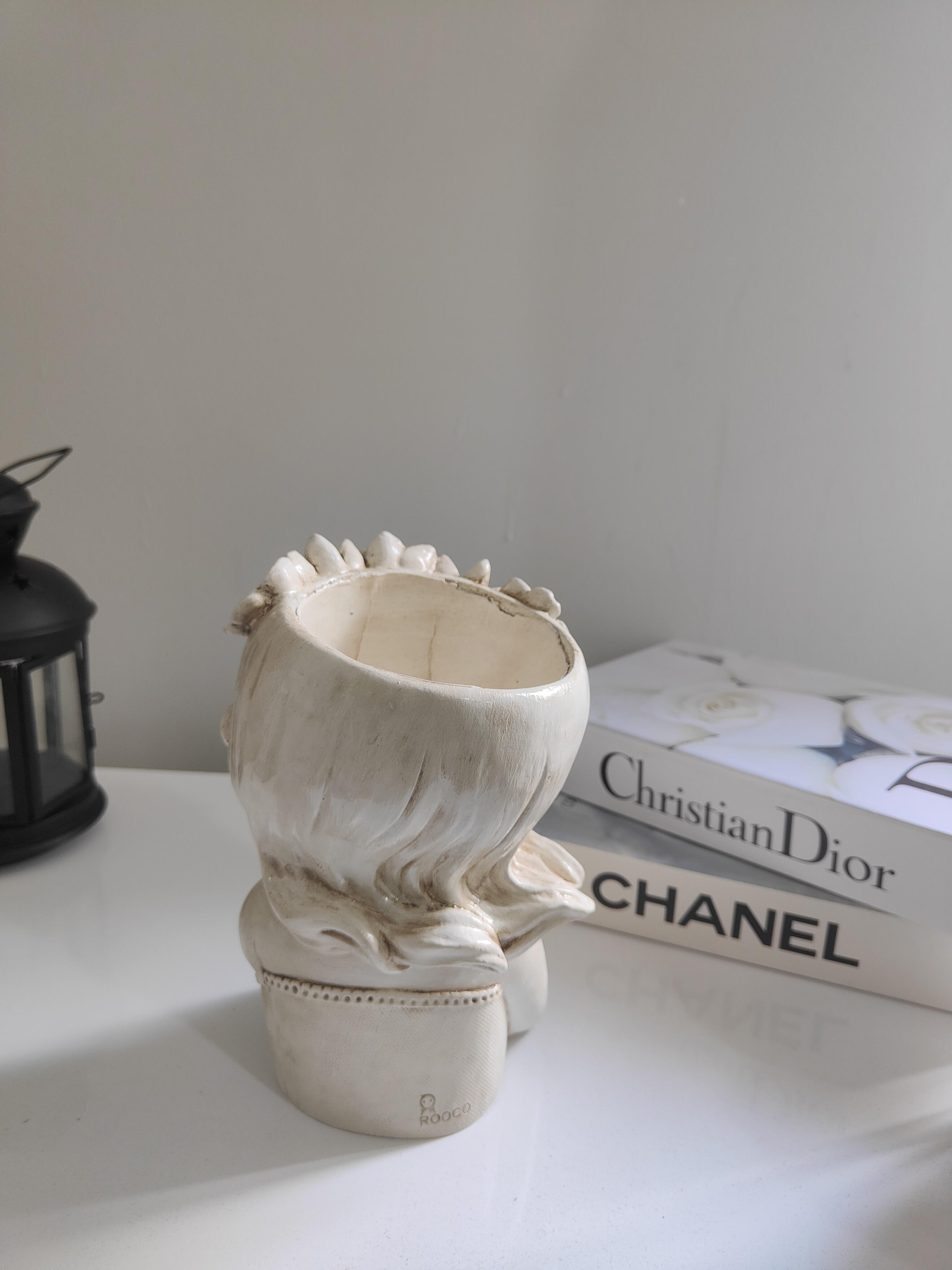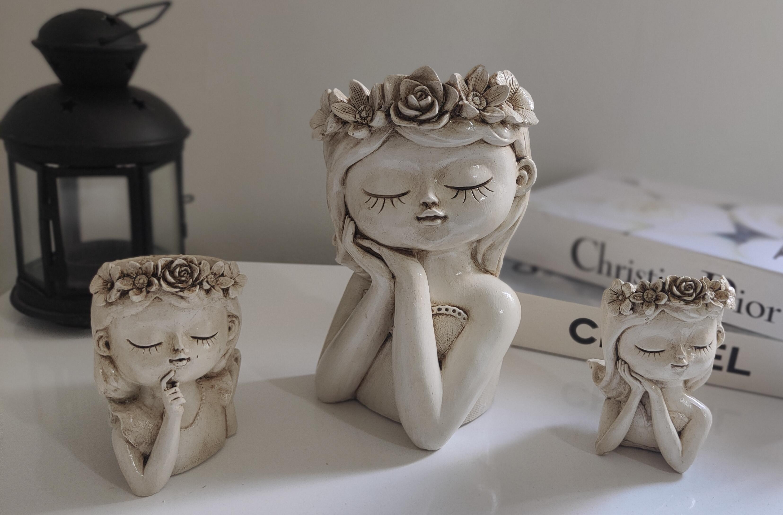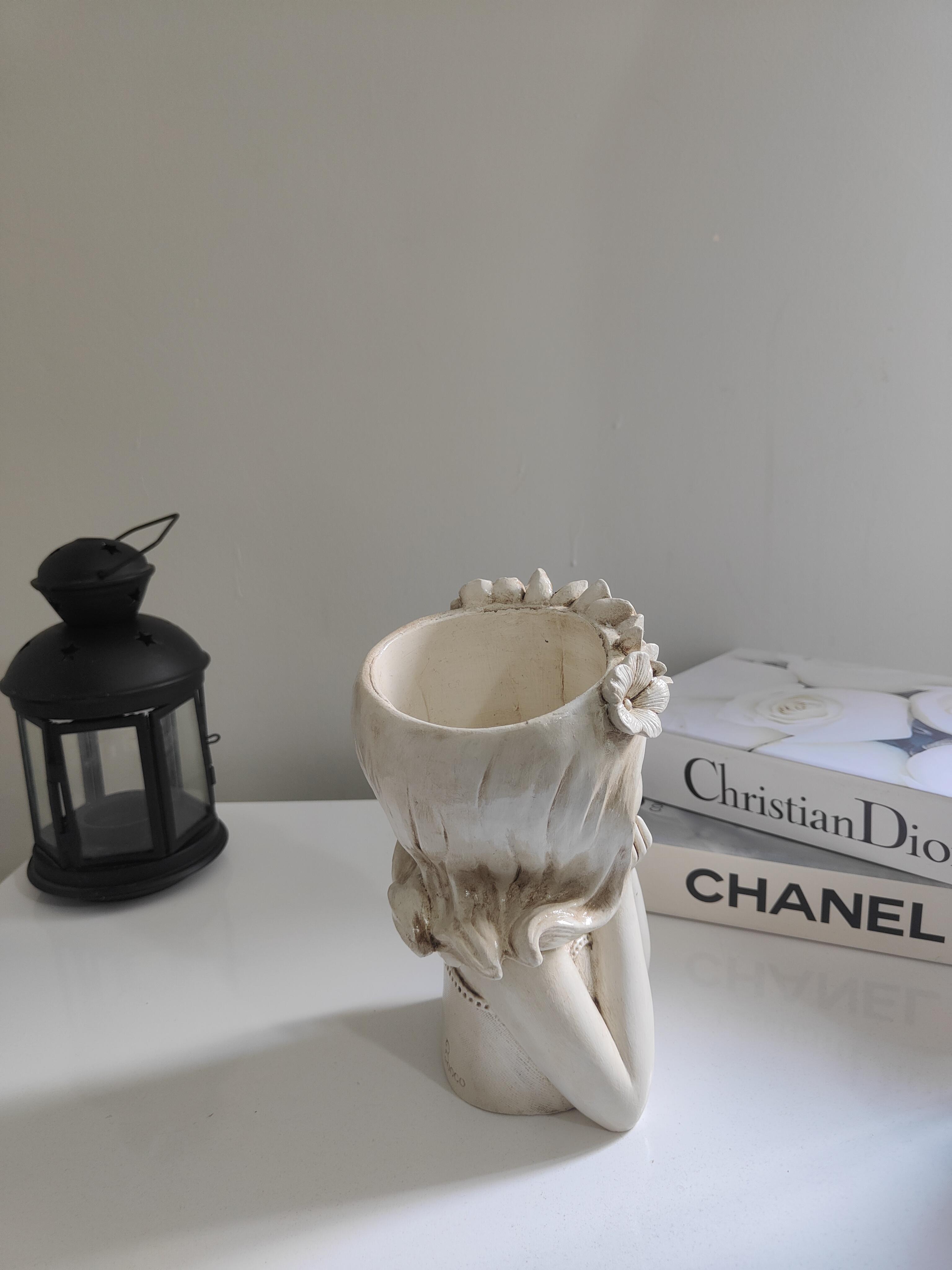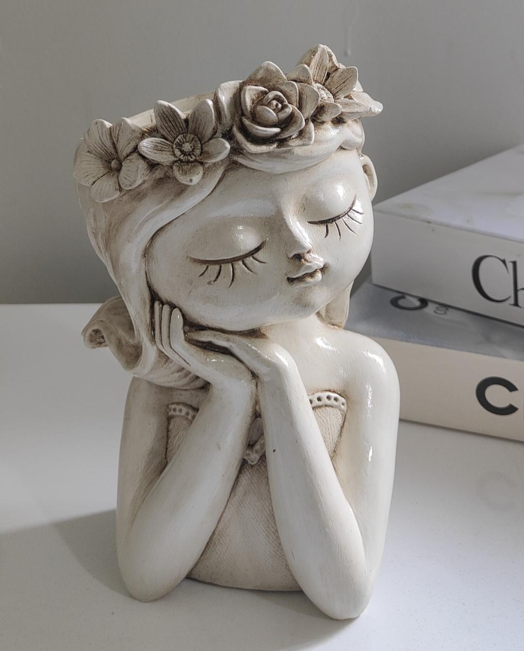 Doğallık ve zarafeti bir araya getiren el yapımı çiçekli uyuyan kız saksı, özel olarak fildişi eskitme tekniği ile boyanmıştır. Başındaki zarif çiçekler ve huzur dolu ifadesi ile bulunduğu ortama romantik ve sakin bir atmosfer katar.