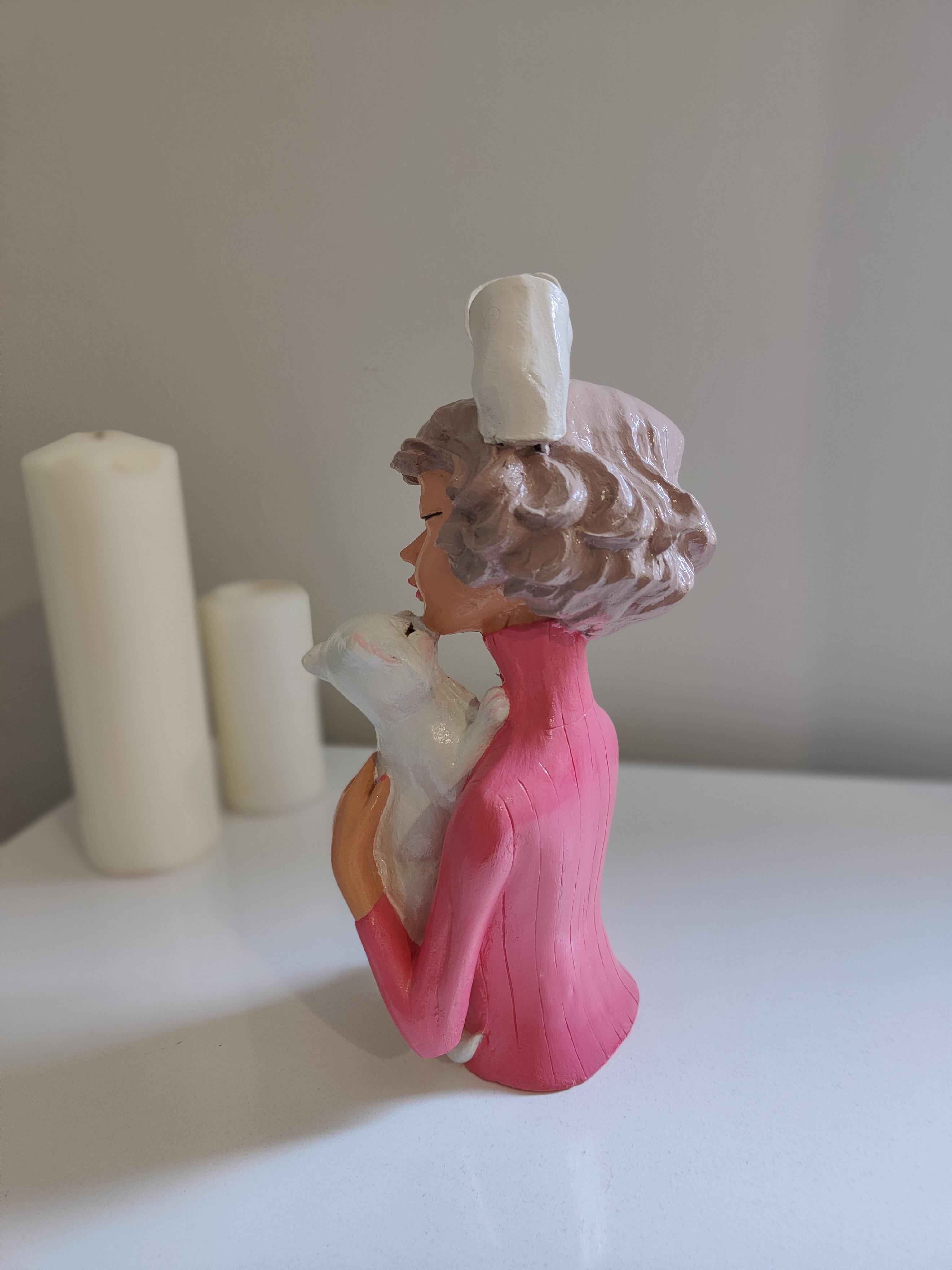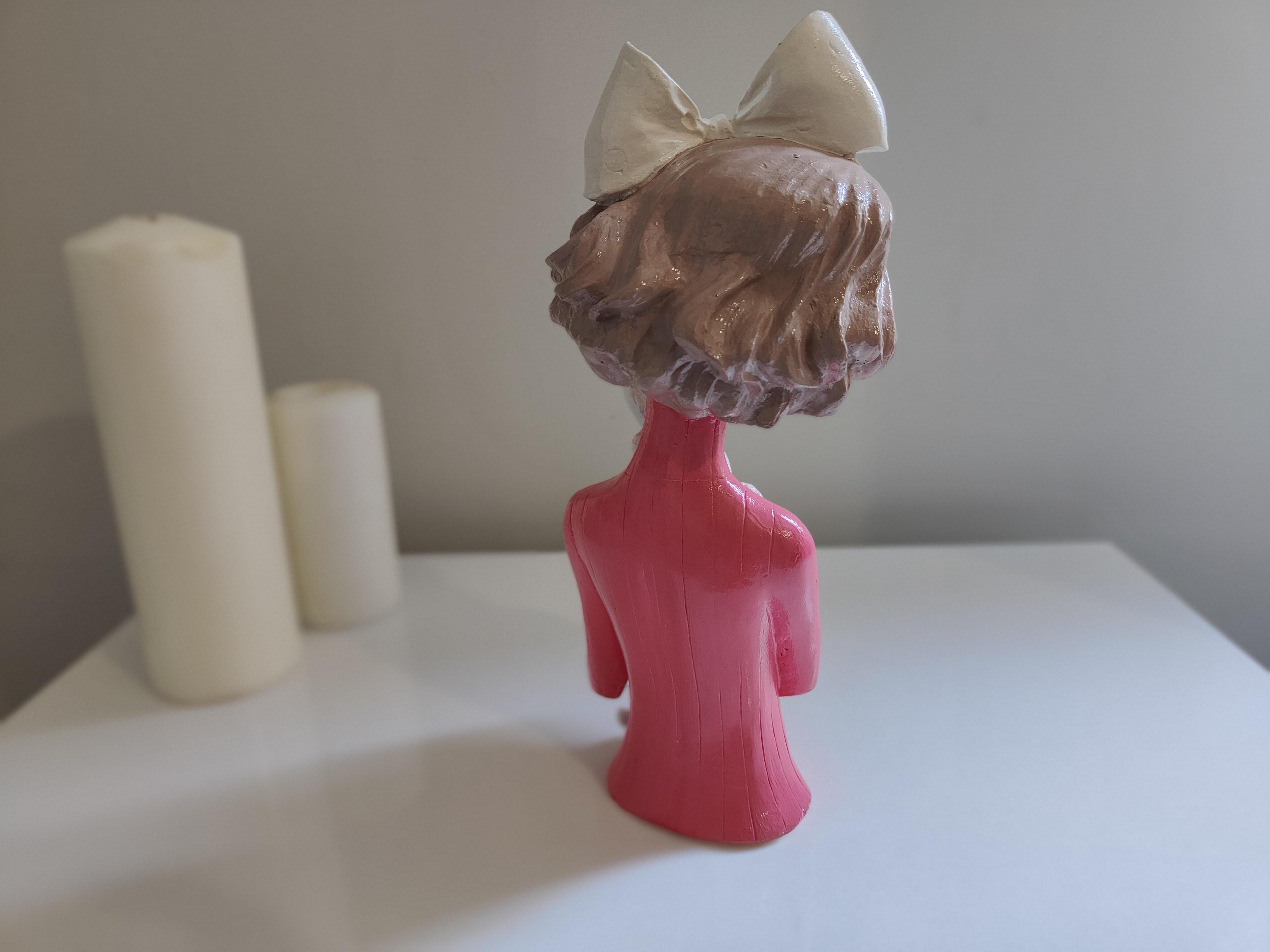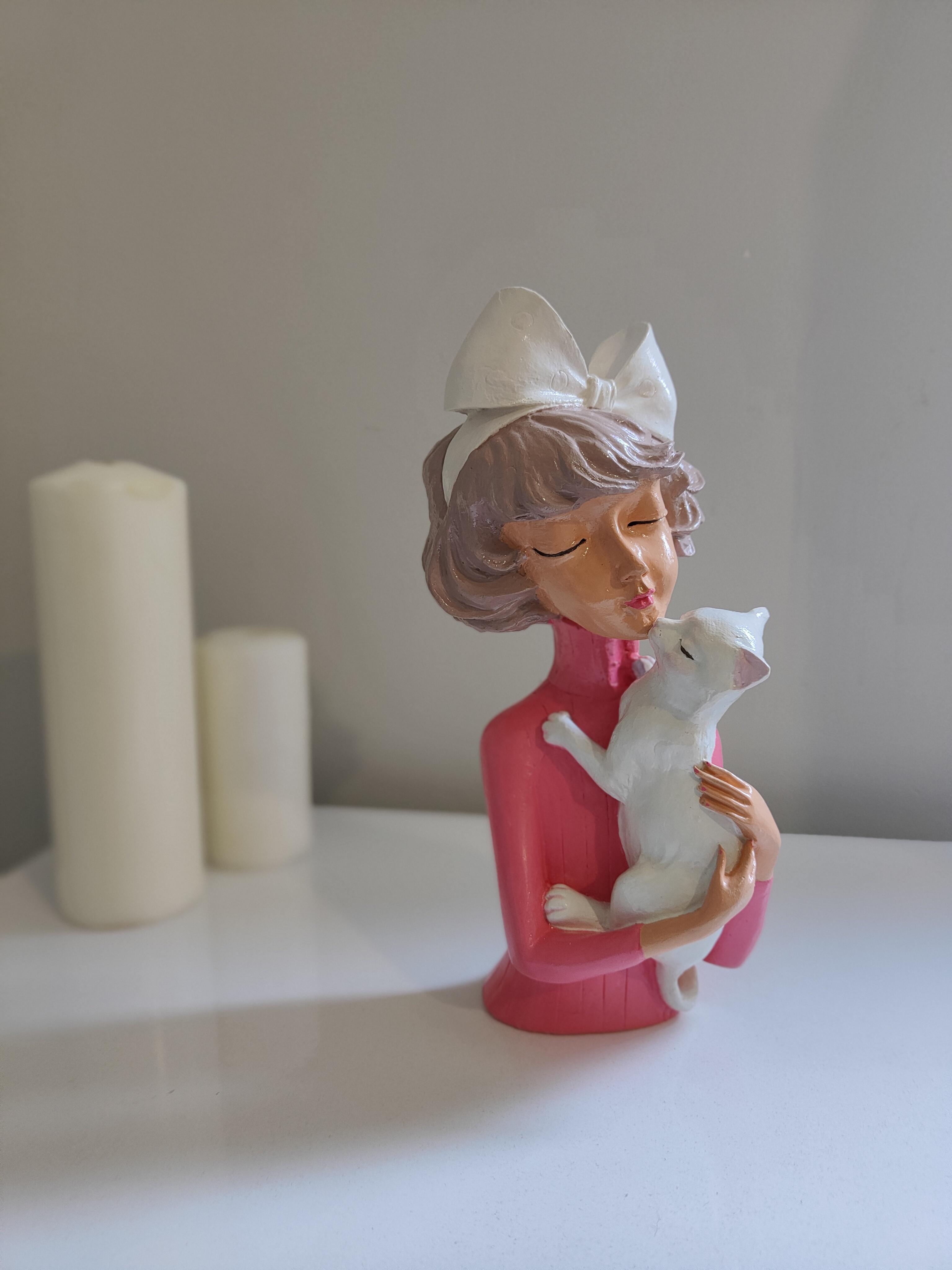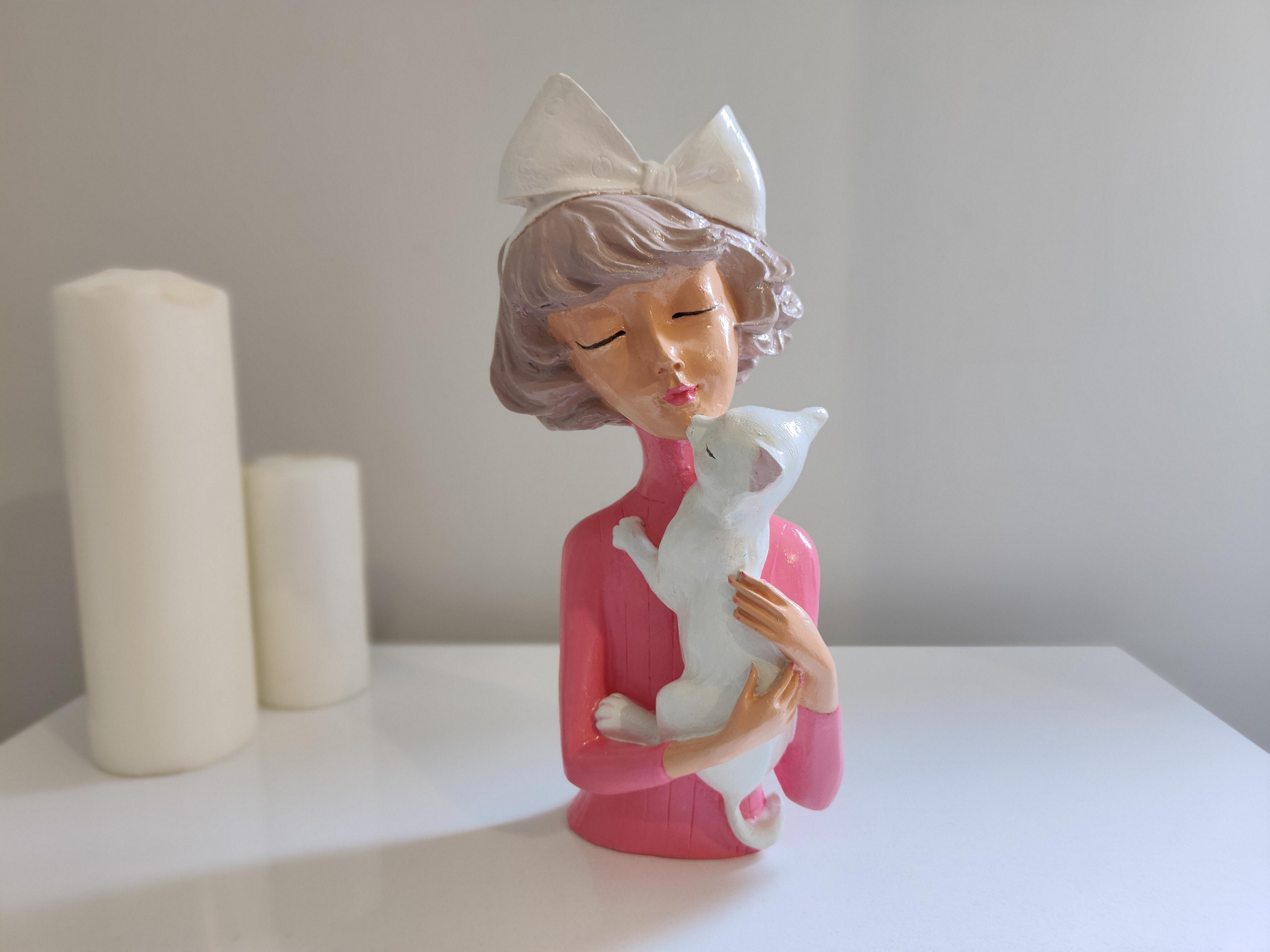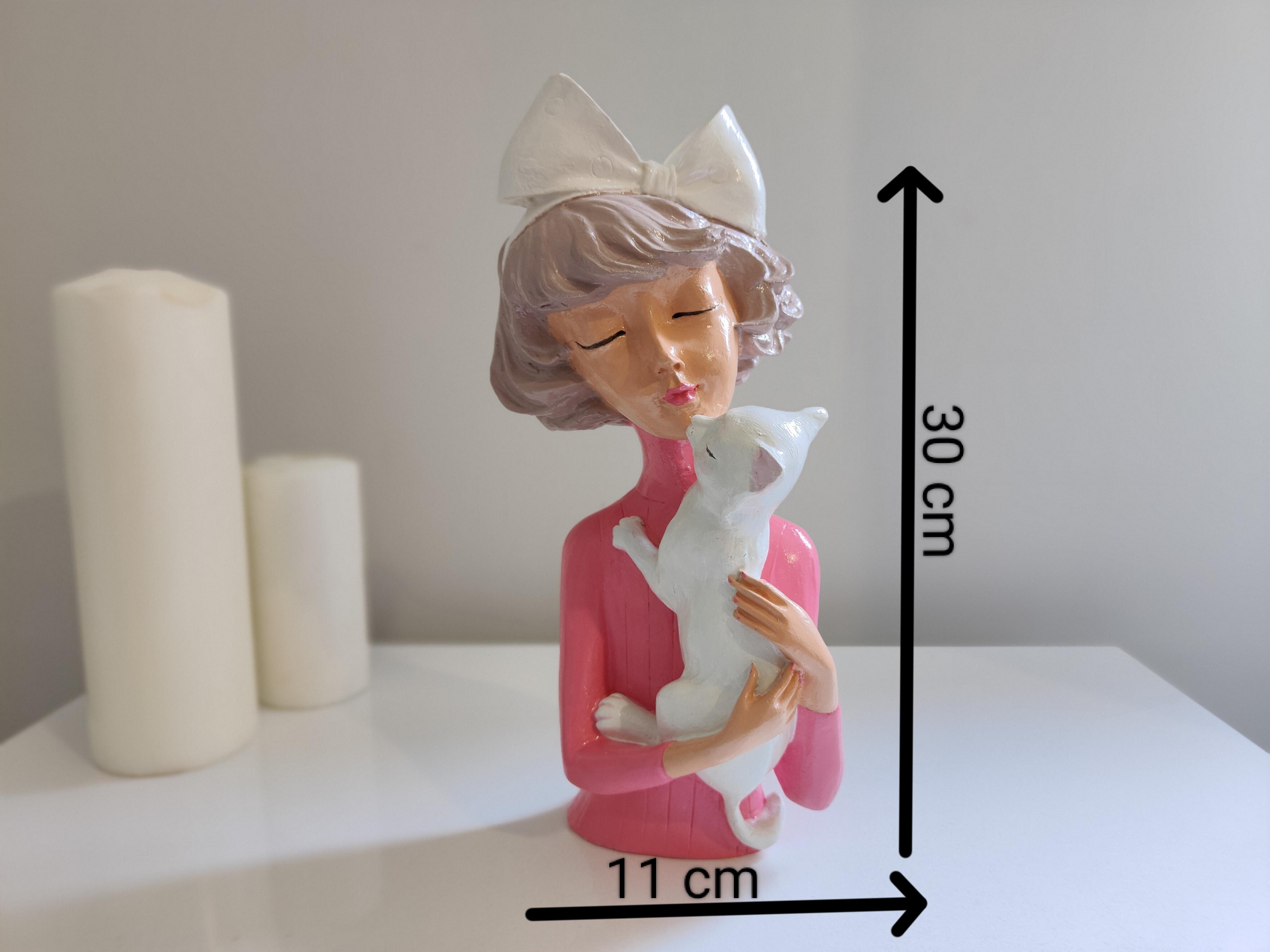 Zarafet ve sevimliliği bir araya getiren Fiyonklu Kız ve Kedisi Biblosu, el işçiliğiyle özenle hazırlanmış benzersiz bir dekoratif objedir. Seramik tozundan üretilmiş, detayları titizlikle işlenmiş ve akrilik boya ile renklendirilip akrilik vernikle korunmuştur. Kucağında sevimli kedisini taşıyan bu narin figür, sıcak ve huzurlu bir atmosfer yaratır.