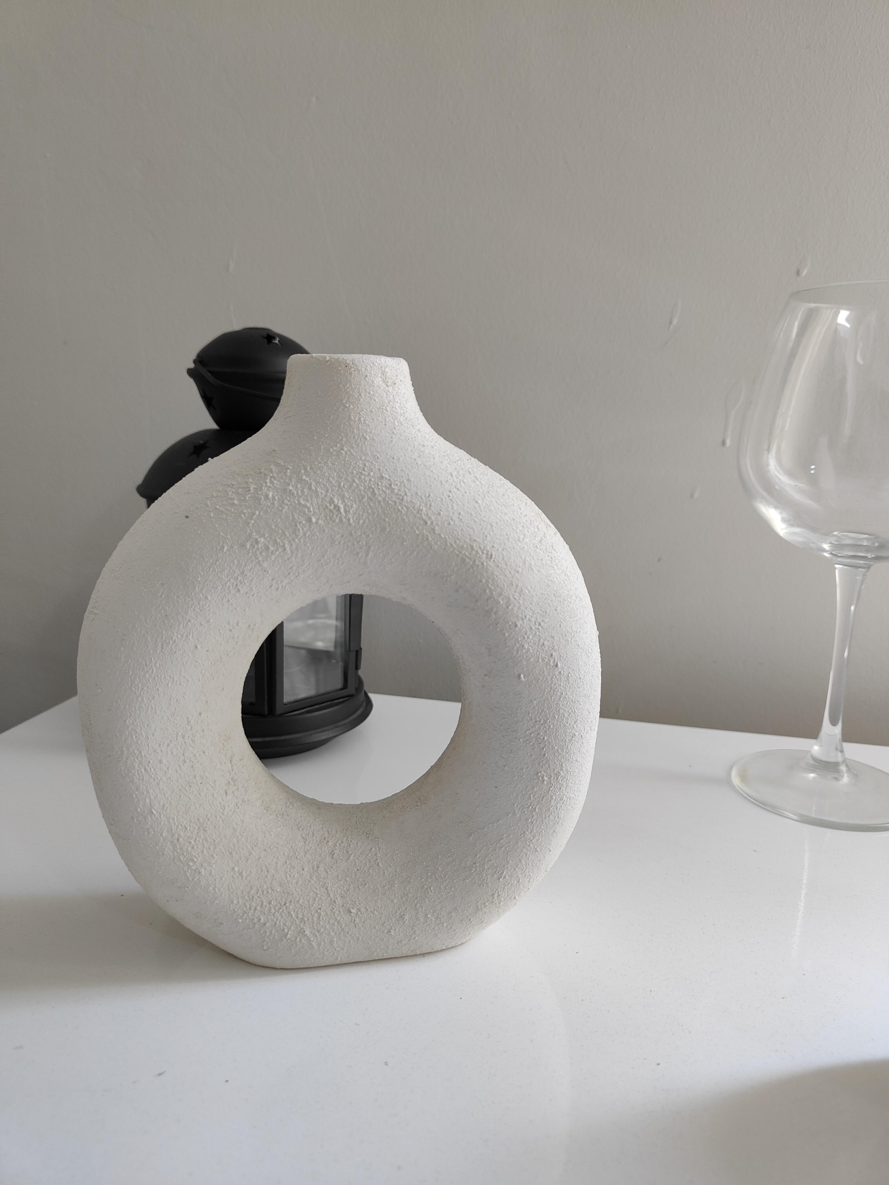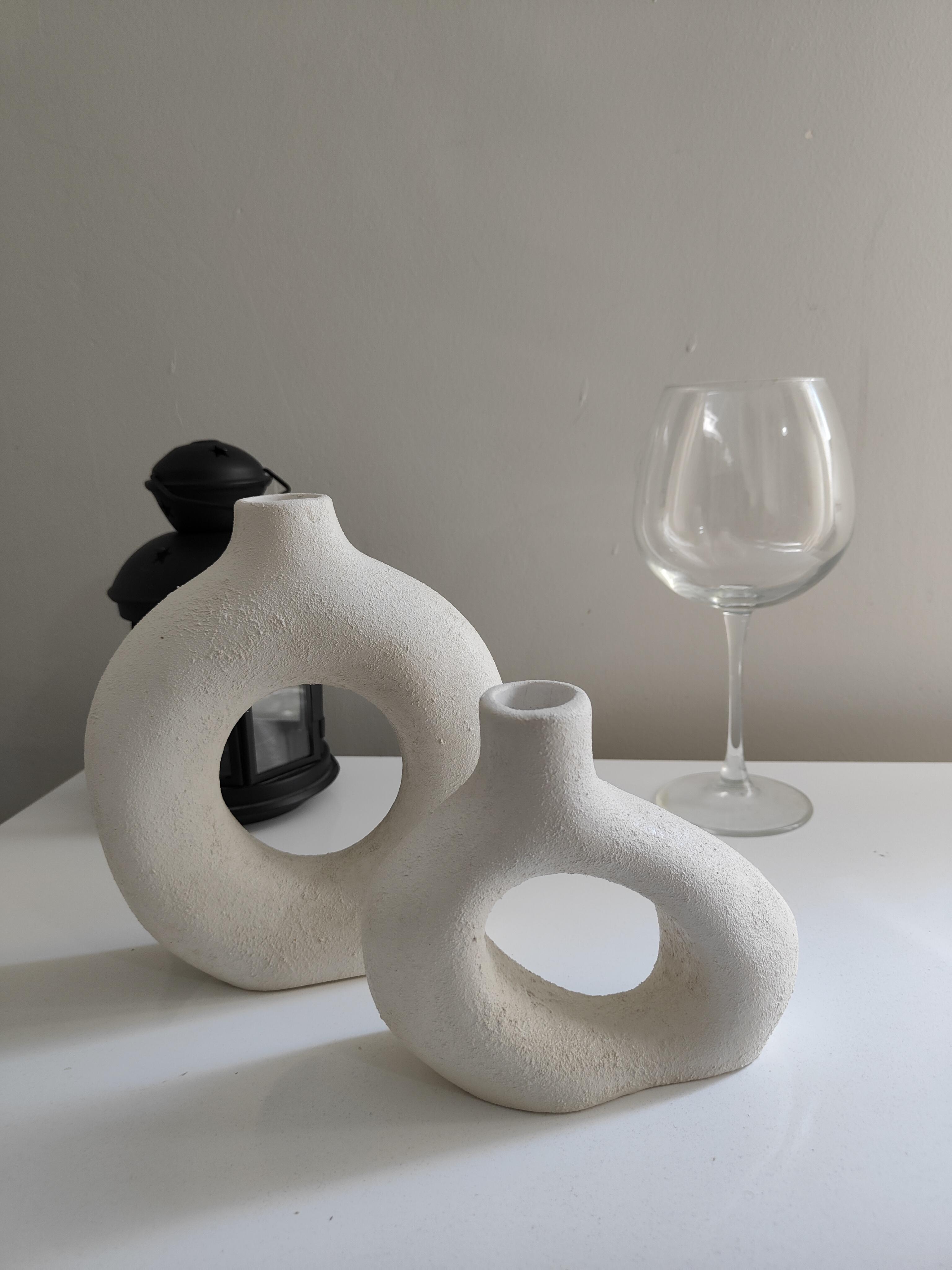 Biri halka formunda, diğeri geometrik figürlü özel tasarım. Seramik tozundan üretilmiş olup, doğal dokusu ve modern tarzıyla dekorasyonunuza sanatsal bir hava katar ,hem vazo hem de estetik bir dekorasyon parçası olarak kullanılabilir. Modern Zamansız ve şık bir görünüm için ideal bir seçim!"