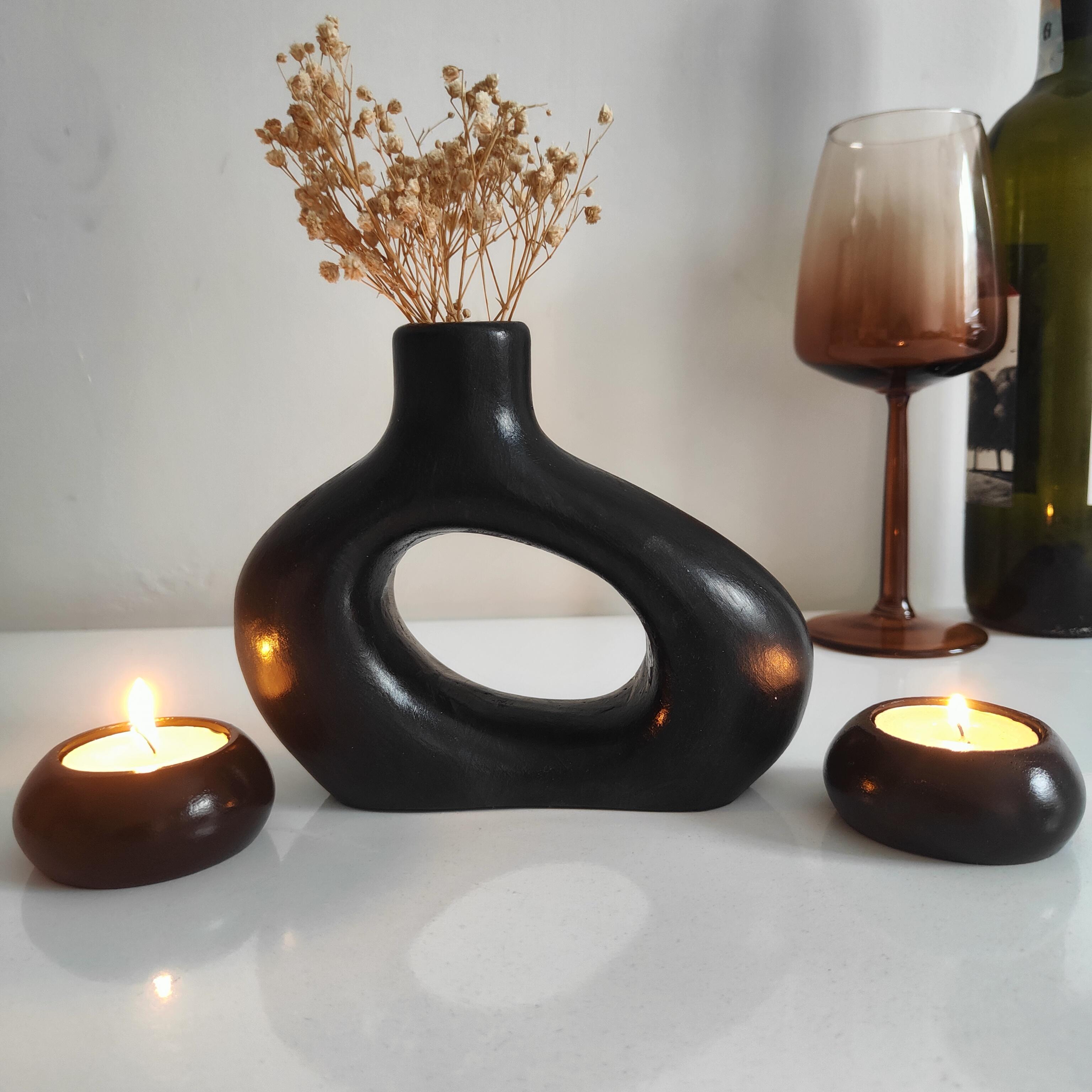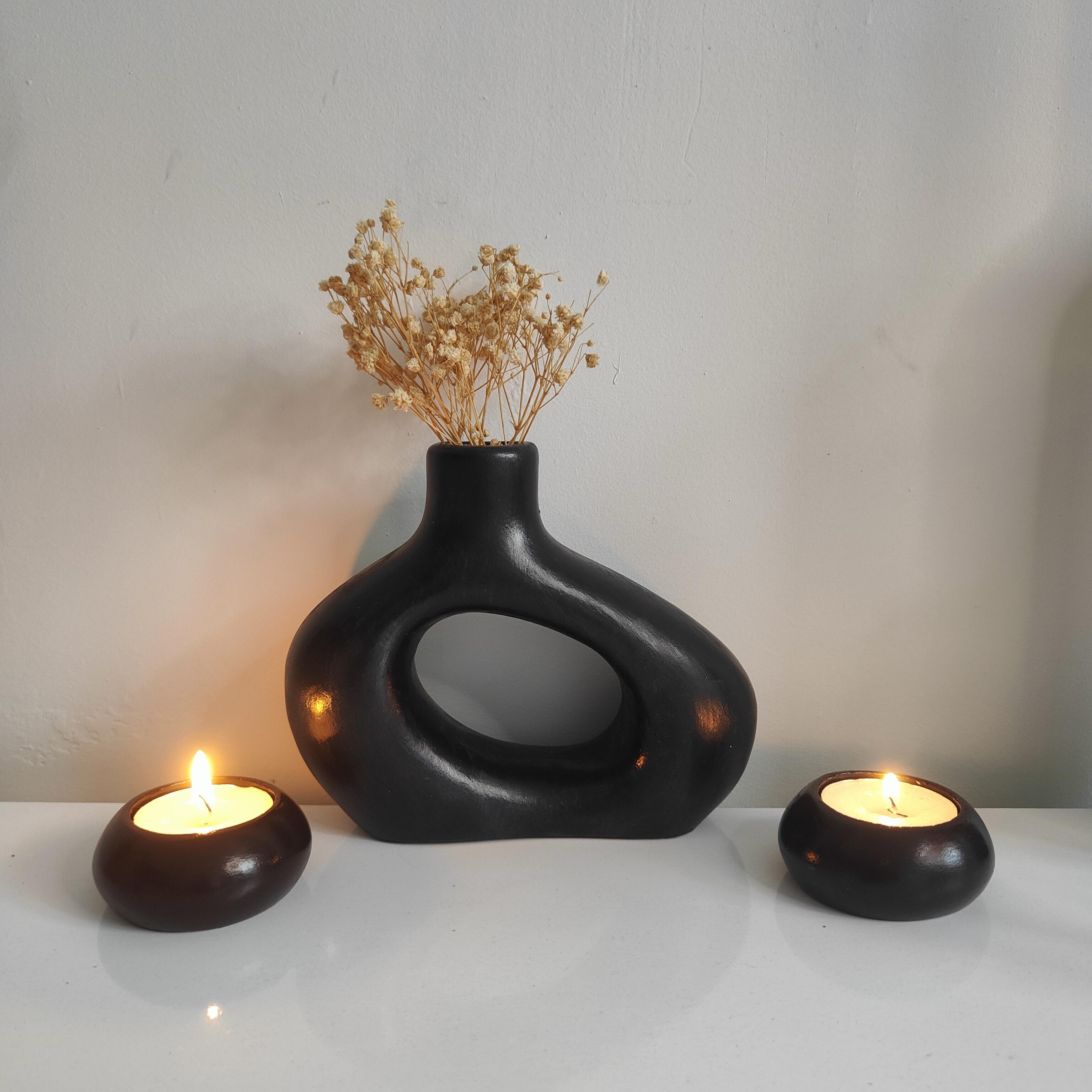 Vazo yükseklik 13 cm Minimalist ve çağdaş tasarımıyla dikkat çeken 3 parçalı geometrik vazo ve mumluk seti, el yapımı seramik tozundan üretilmiş ve özel akrilik boya ile boyanmıştır. Keskin hatları ve modern formuyla mekanınıza estetik bir dokunuş katar.