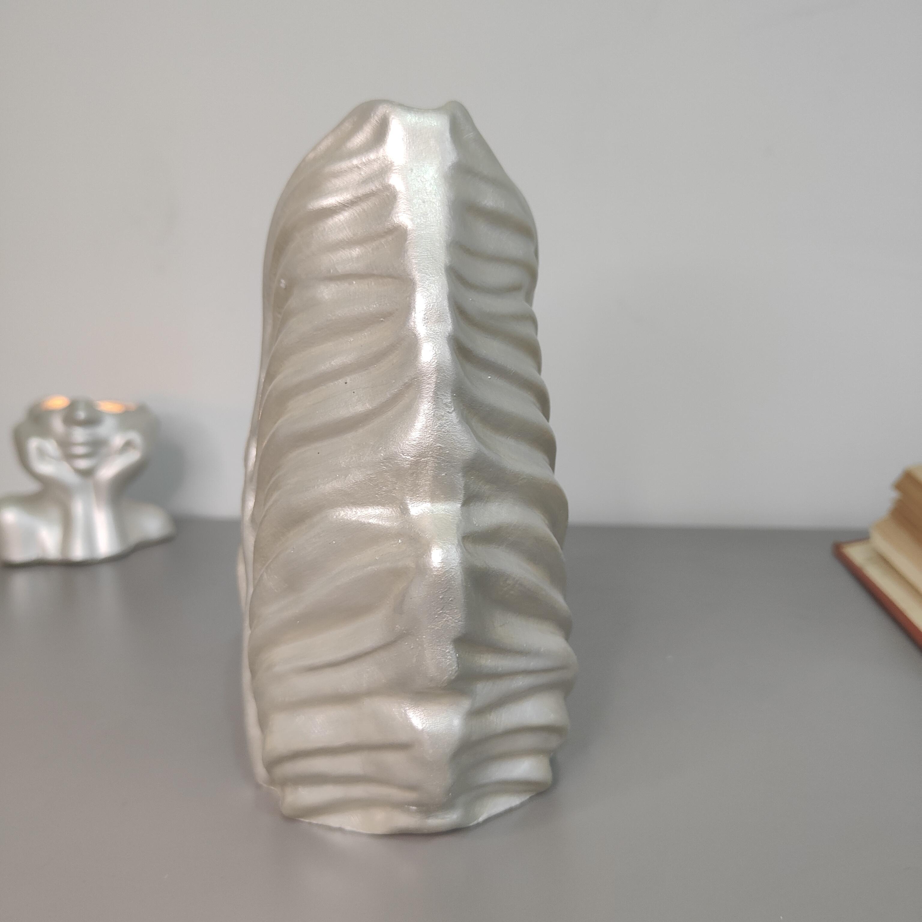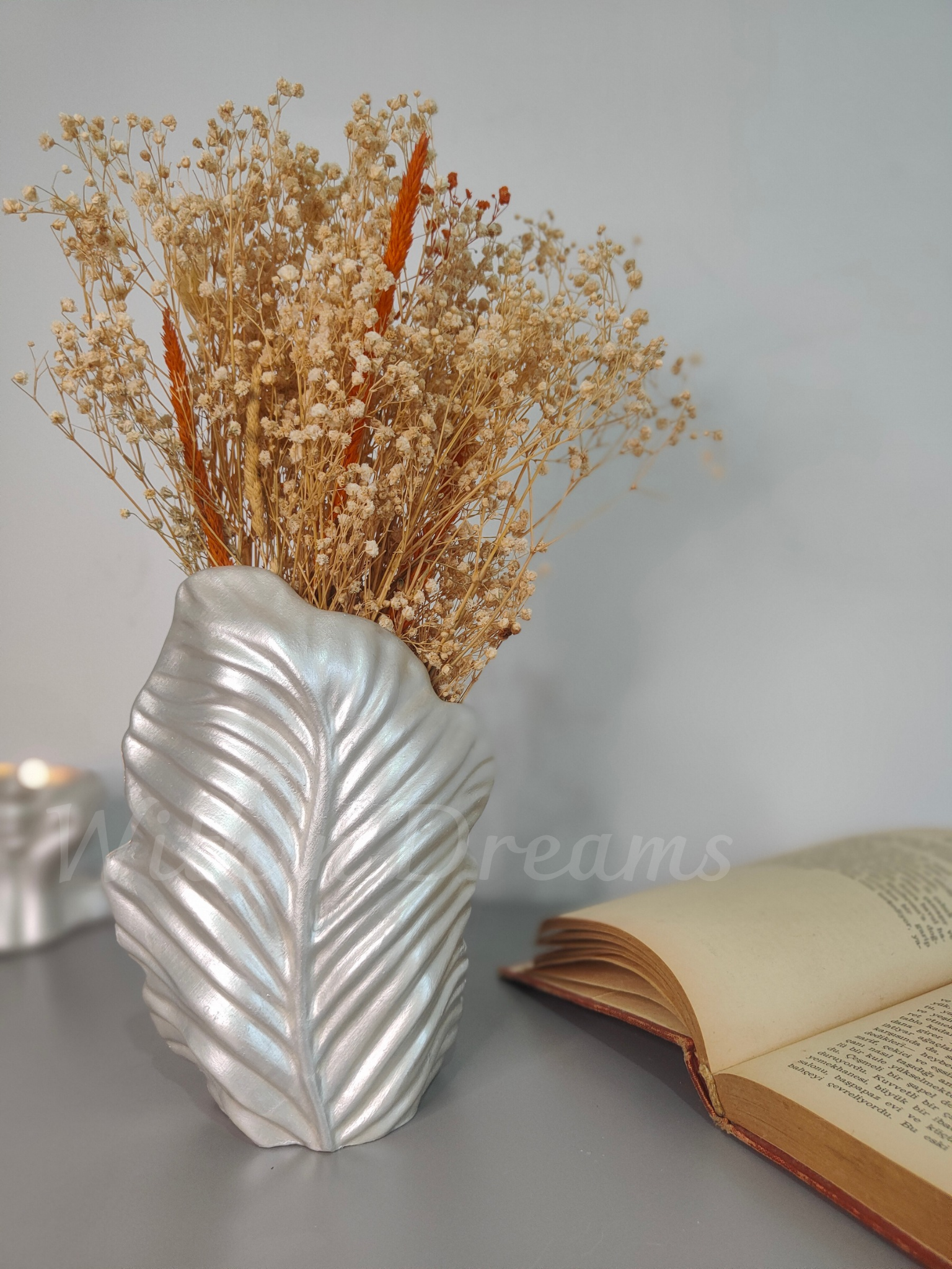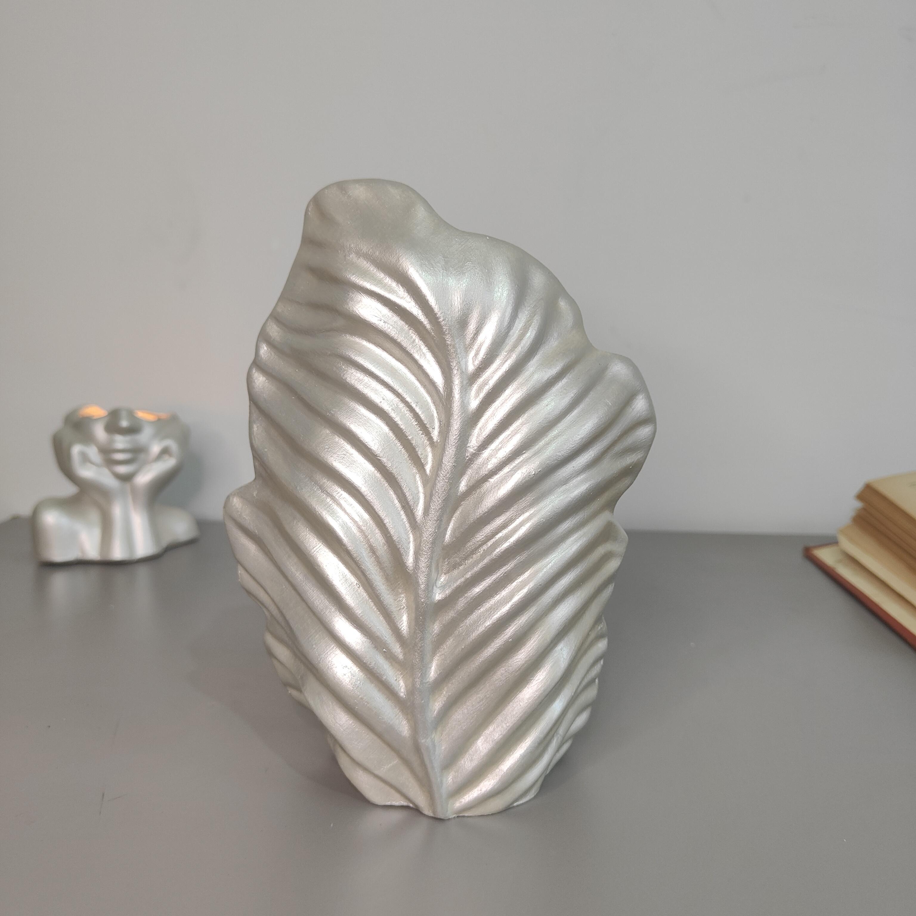 "El emeğiyle üretilmiş, seramik tozundan yapılmış bu yaprak desenli vazo , doğal ve zarif tasarımıyla dekorasyonunuza şıklık katıcak. .Lütfen alçı ile dökümü yapılmış ,boyasız ham objelerle karşılaştırma yapmayın ; kalite ve işçilik farkını hissedin."