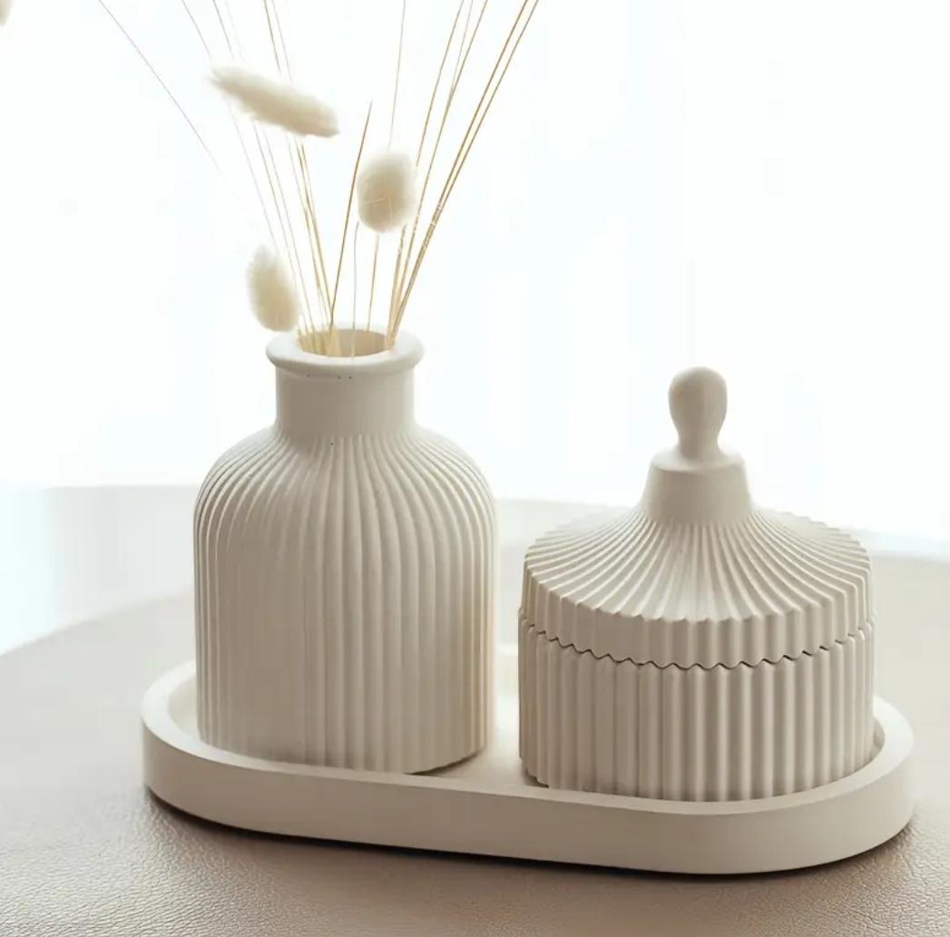 ✔ Minimal çizgili küçük vazo – Çiçekleriniz veya dekoratif objeleriniz için şık bir tamamlayıcı.