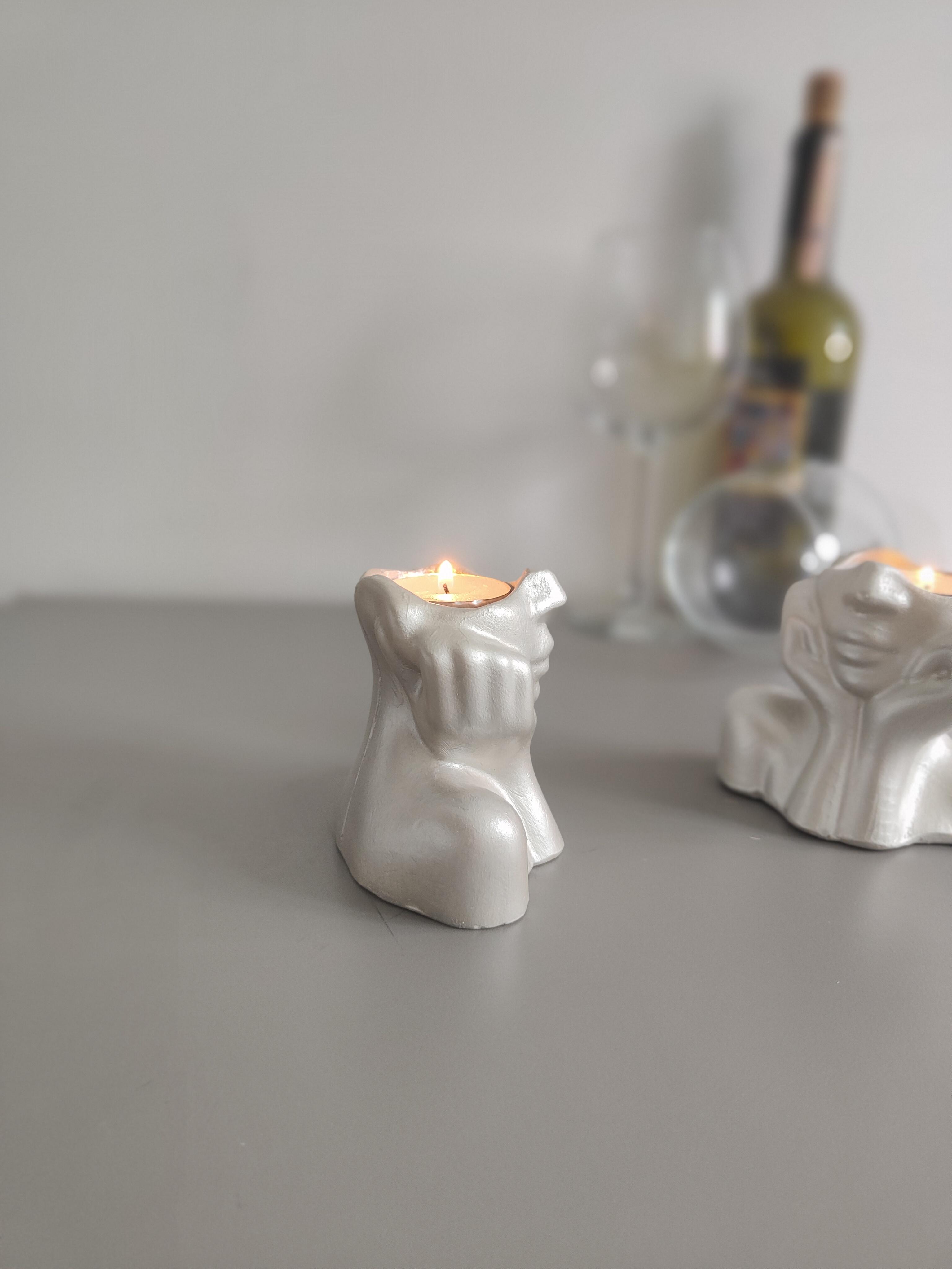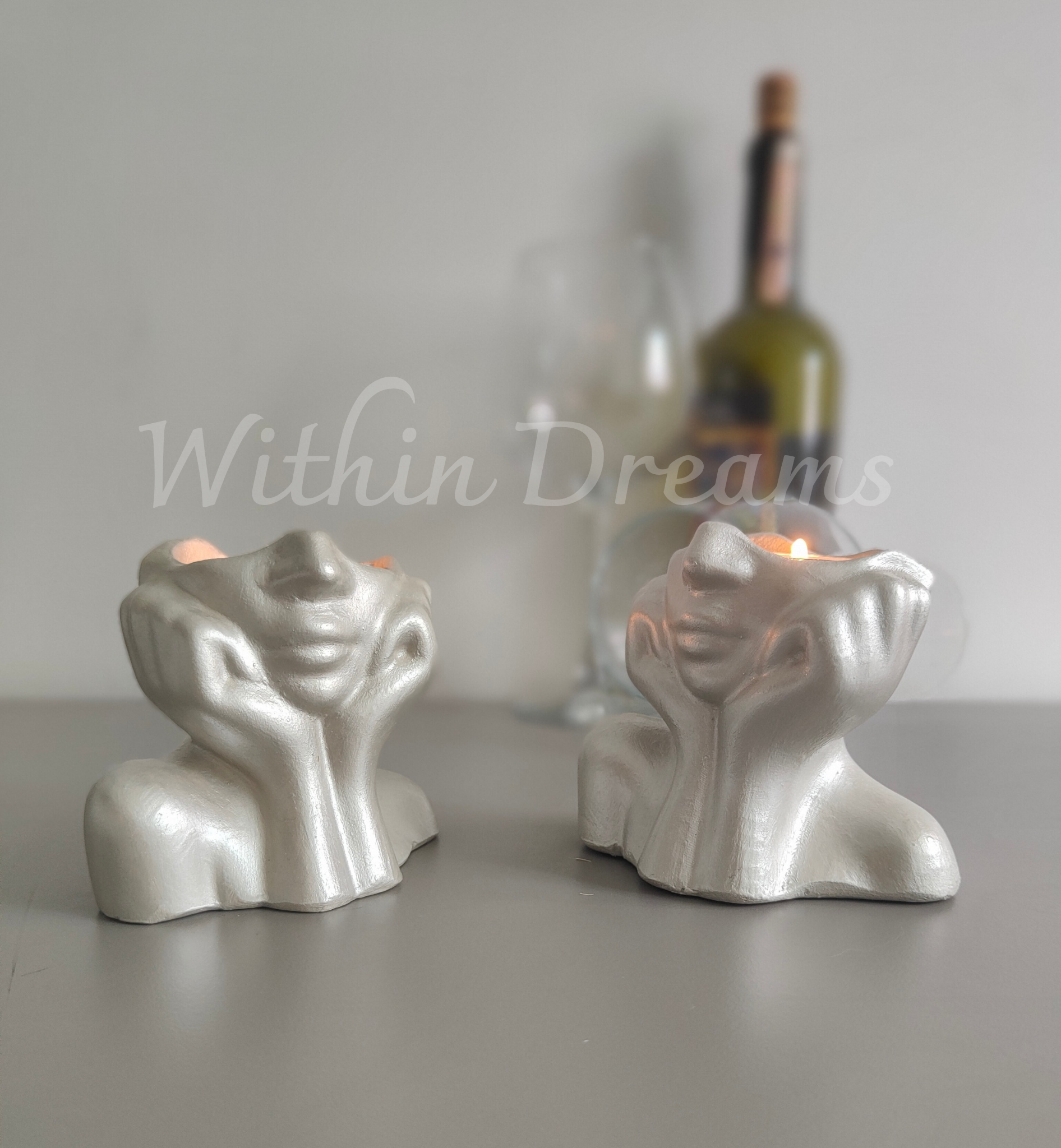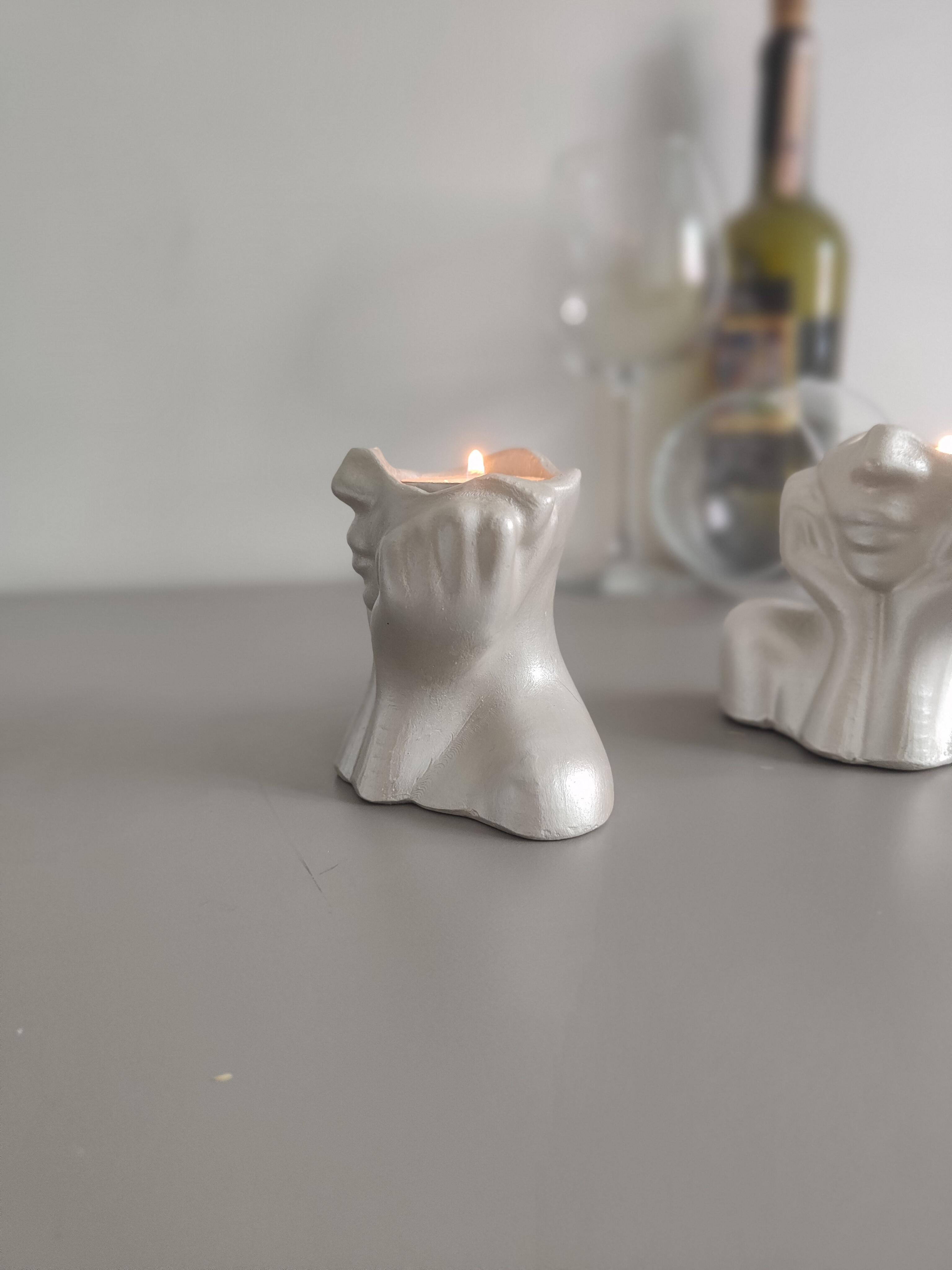 Dekorasyonunuza modern ve sanatsal bir dokunuş katacak el yapımı yüz formundaki şamdan seti, seramik tozu kullanılarak özenle üretilmiştir. Gümüş metalik renkte akrilik boya ile boyanmış olup, zarif ve sofistike bir görünüm sunar.