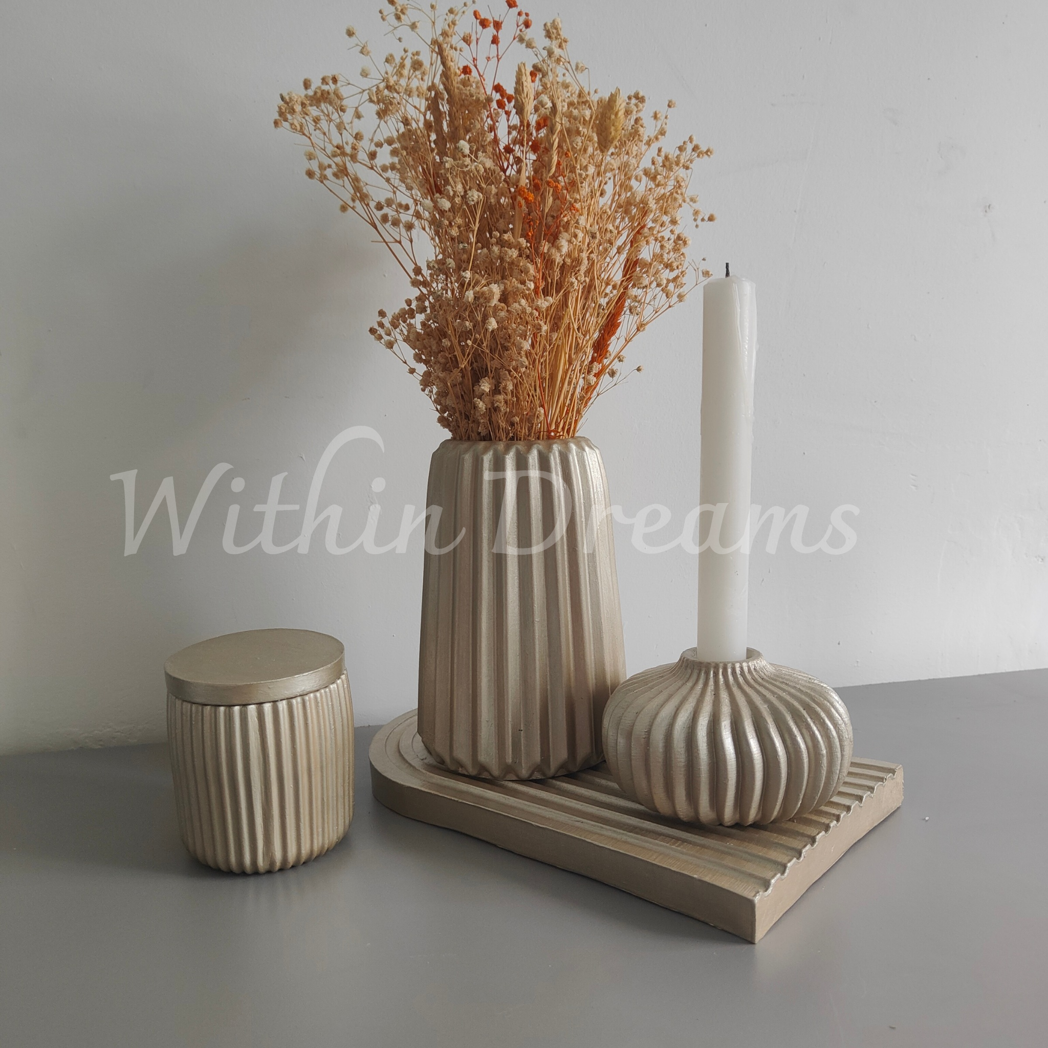 Doğal dokular ve modern çizgilerin birleştiği bohem Platin çizgili 4 parça set, el yapımı seramik tozundan üretilmiş olup akrilik boya ile özenle boyanmıştır. Set, estetik ve işlevselliği bir araya getirerek dekorasyonunuza benzersiz bir dokunuş katar.