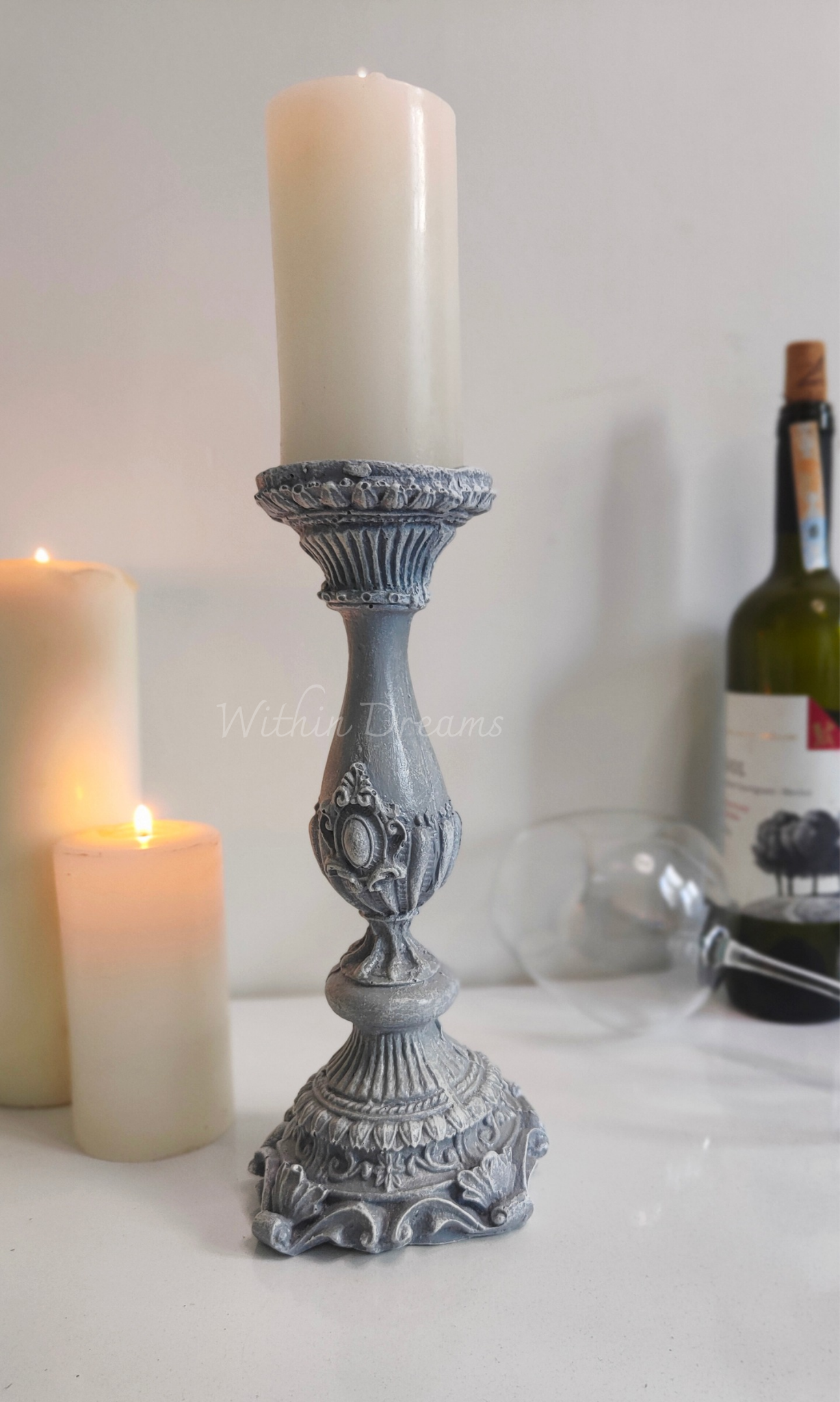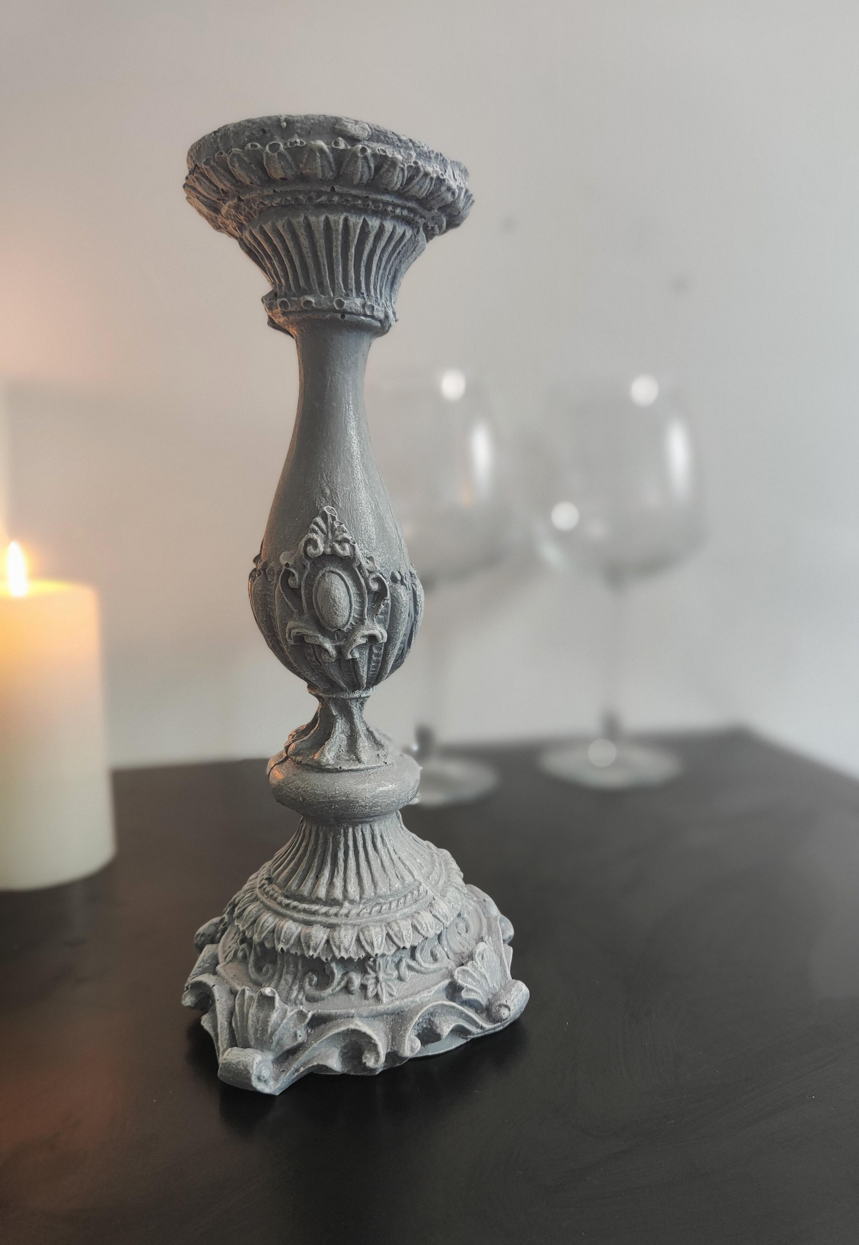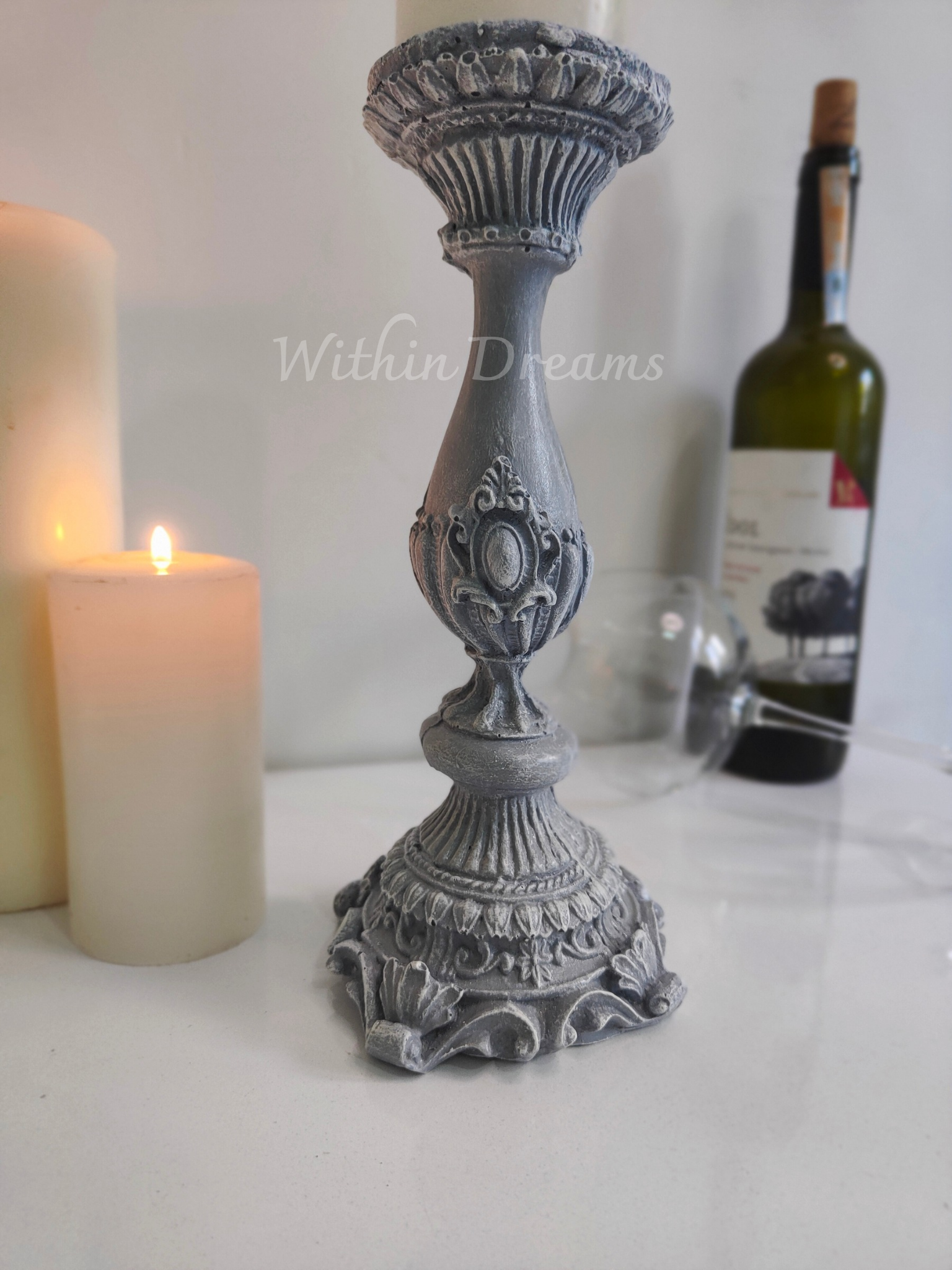 Zarif ve nostaljik tasarımıyla dikkat çeken bu vintage şamdan, seramik tozundan üretilmiş ve gri akrilik boya ile özenle boyanmıştır. 28 cm uzunluğundaki yapısı, yemek masalarınızda, konsol üstlerinde veya dekoratif köşelerde şık ve sofistike bir atmosfer yaratır.