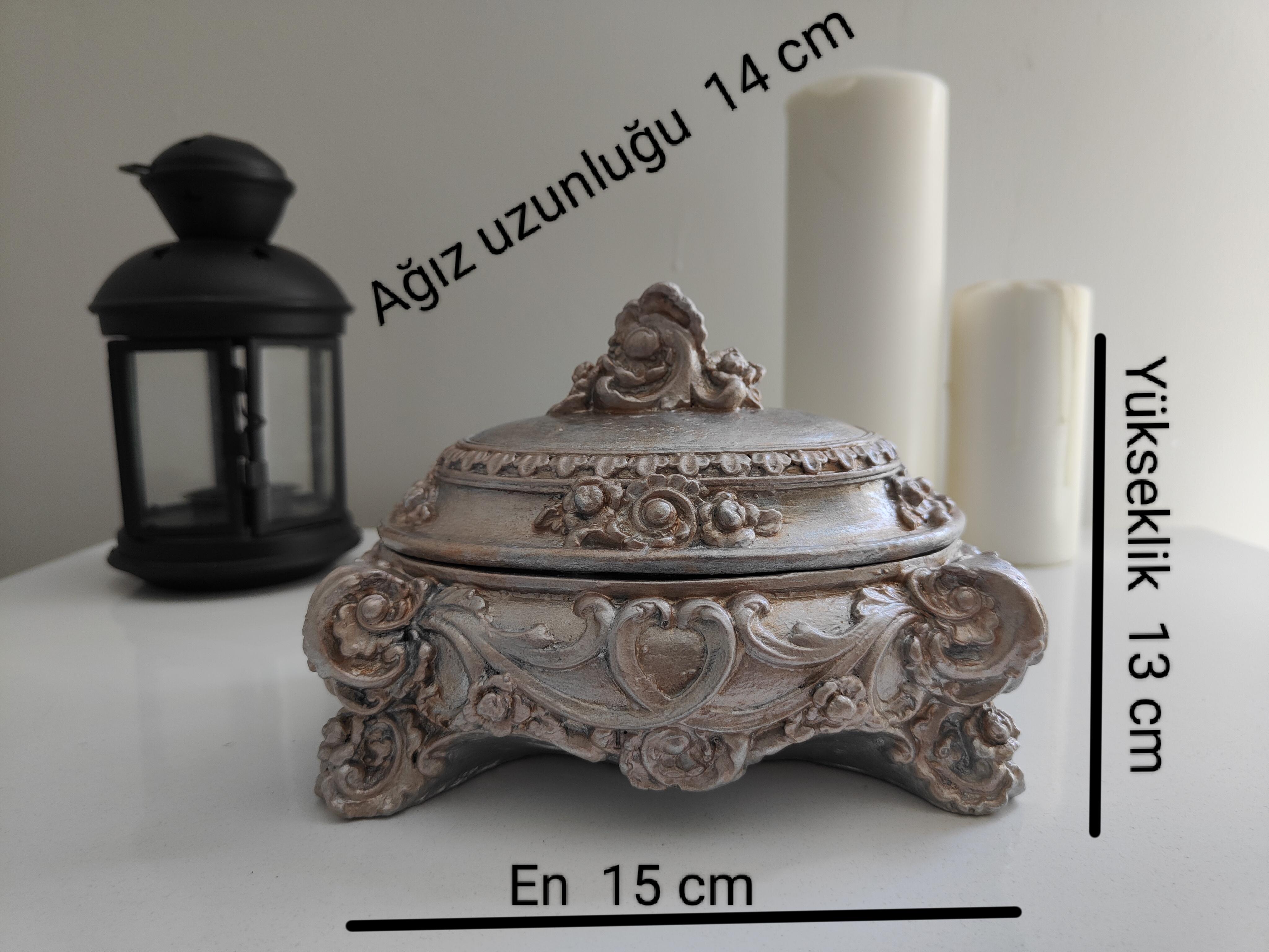 Takı, makyaj malzemesi, anahtarlık gibi küçük eşyalarınızı düzenli bir şekilde saklayabileceğiniz bu kutu, hem şık bir aksesuar hem de zarif bir dekoratif obje olarak kullanılabilir. Özel günlerde sevdiklerinize hediye edebileceğiniz bu zarif tasarım, yaşam alanlarınıza nostaljik bir dokunuş katacak.