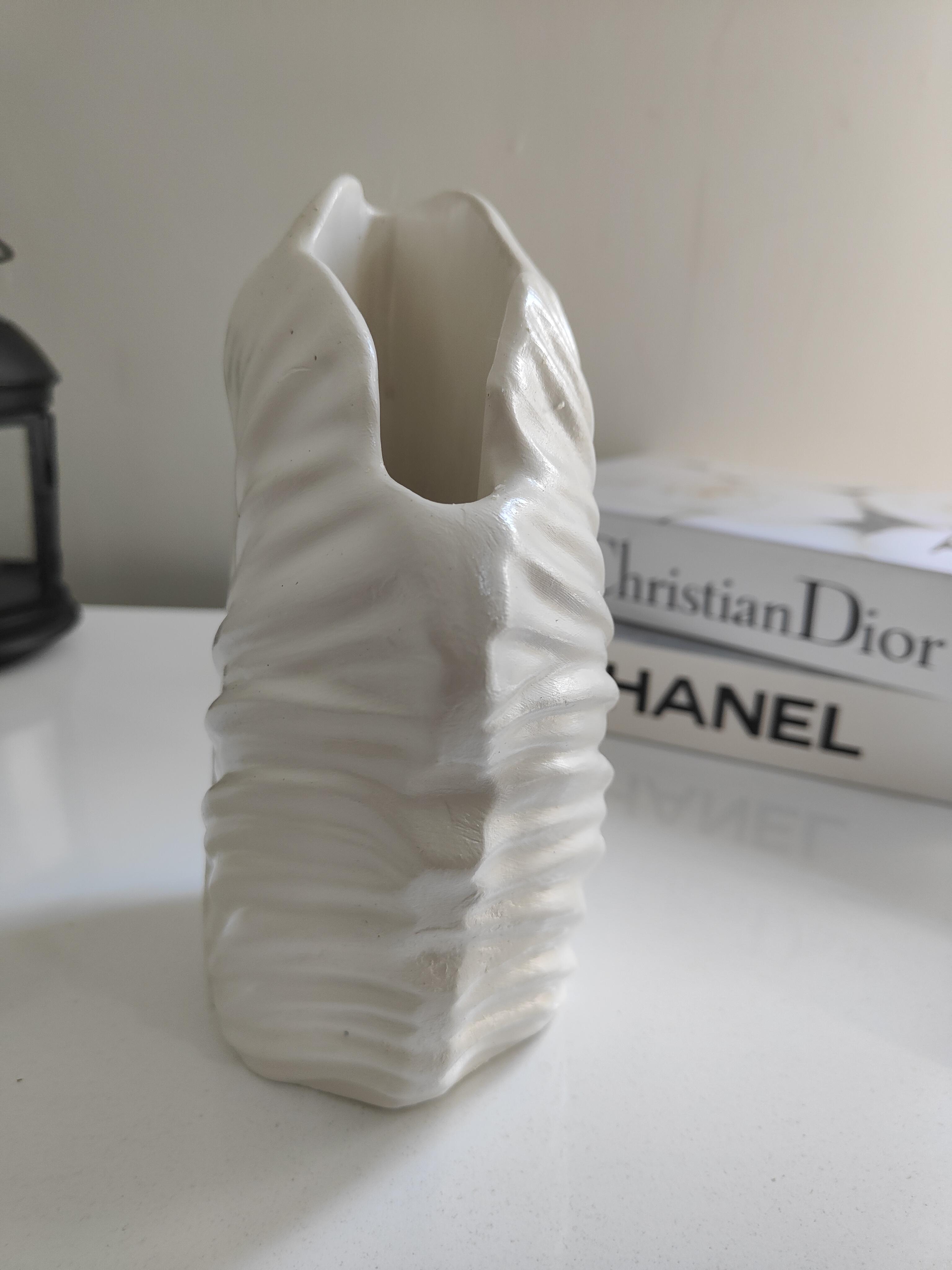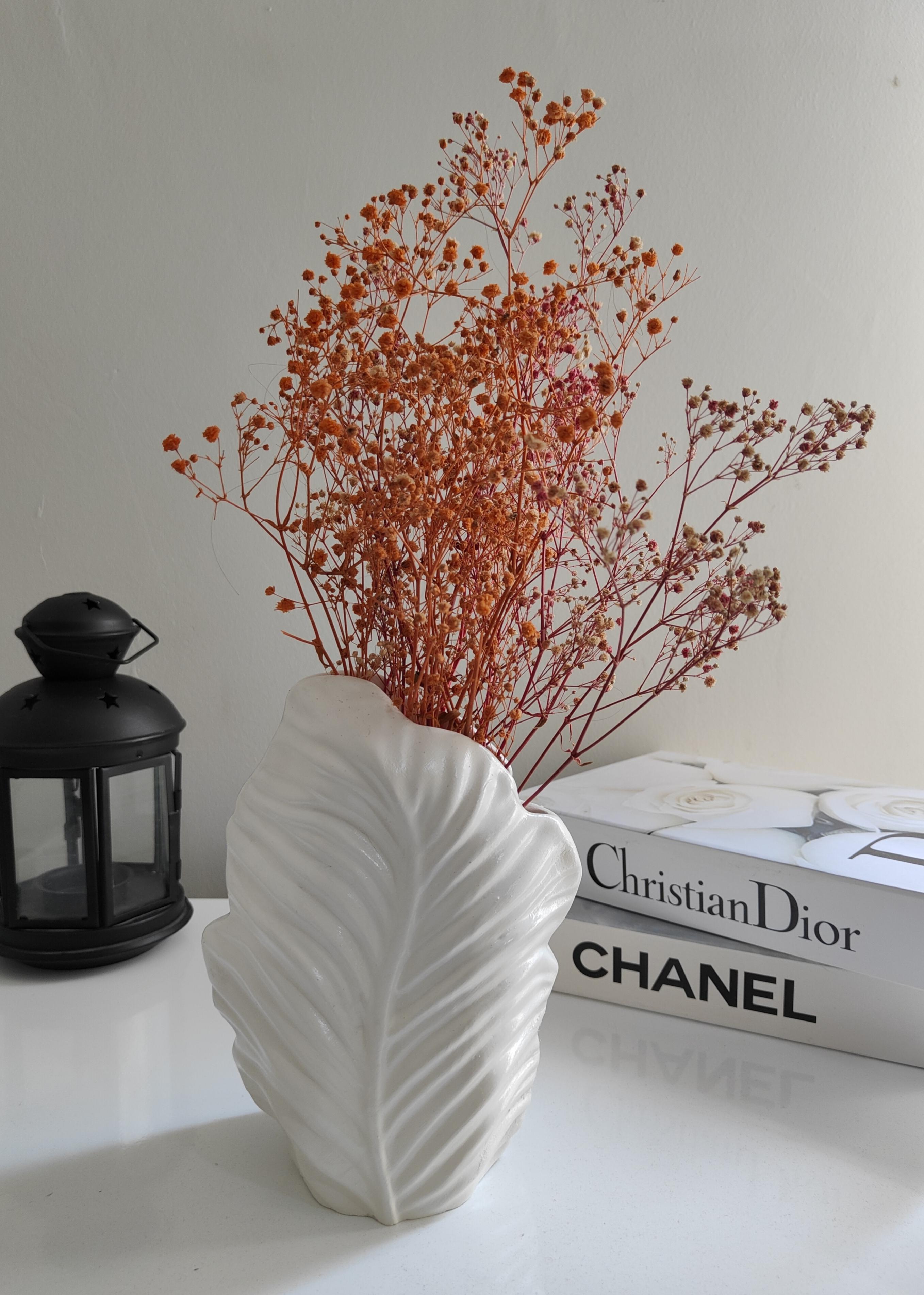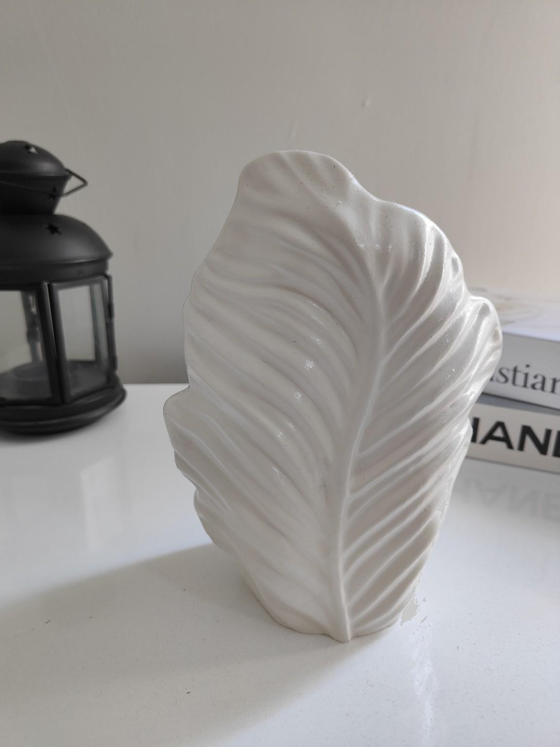 "El emeğiyle üretilmiş, seramik tozundan yapılmış beyaz yaprak desenli vazo. Doğal ve zarif tasarımıyla dekorasyonunuza şıklık katıcak .Lütfen alçı ile dökümü yapılmış ,boyasız ham objelerle karşılaştırma yapmayın ; kalite ve işçilik farkını hissedin."